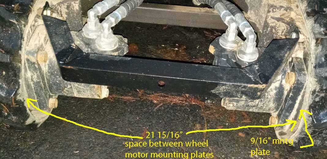 Corrected my spacing above. 21 15/16" between wheel motor mounting plates. My plates are 9/16" thick. Photo attached.