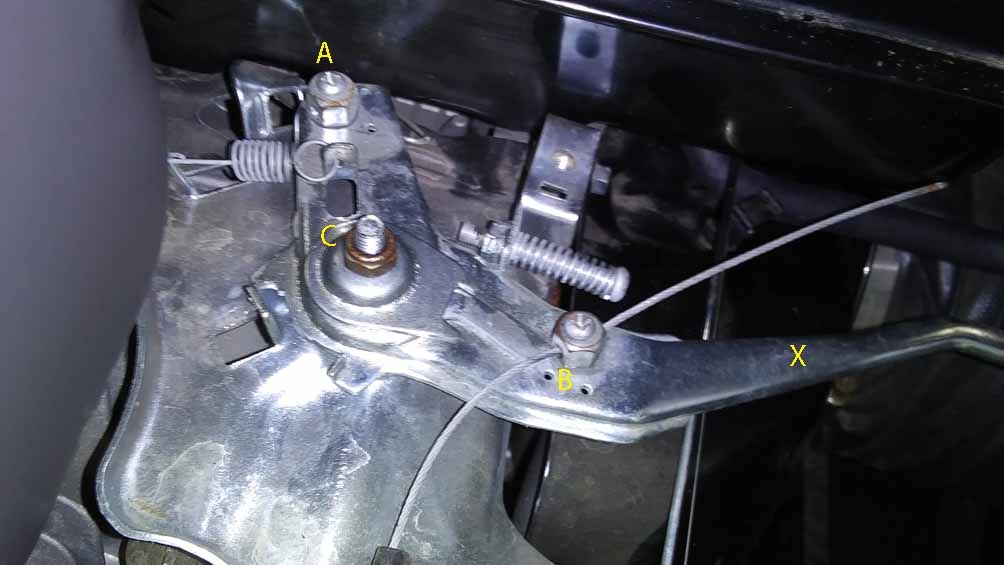 The Ouke machines attached the cable at B. I used A for my Duromax. If you drill a hole at X, and relocate the clamp from B to X, the lever has a longer stroke will work much better. The clamp at B should be used to install a 2nd throttle return spring, which I have done on the Duromax.