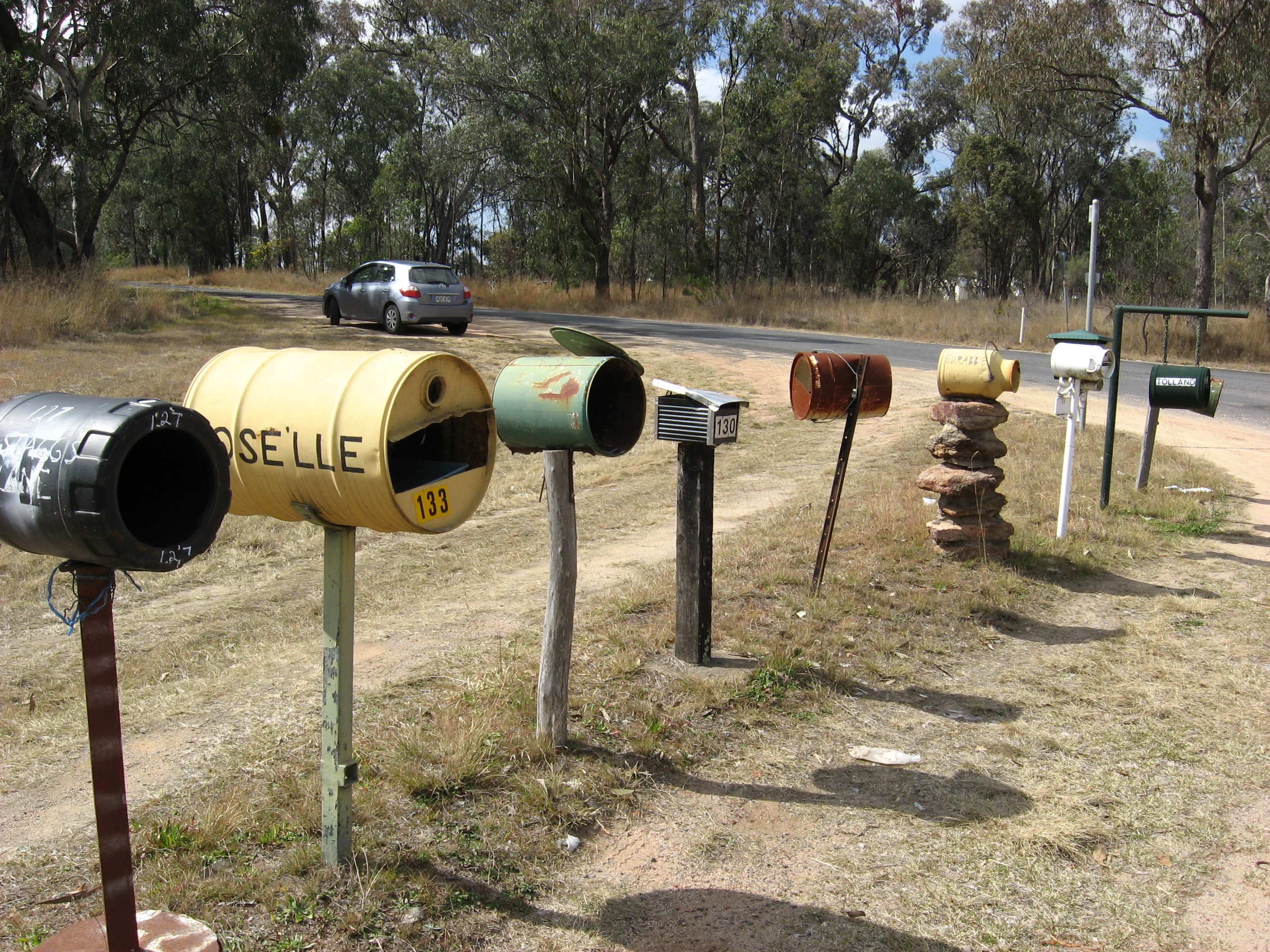 I put a 2' dia. x 18" high concrete cylinder with a 4x6 post out of the top and set a box on top extended forward a little so the concrete wouldn't hurt a car door. It was daunting to look at and the postmaster told me to get rid of it because it is a hazard and someone would get killed if they hit it at highway speeds. I didn't tell the redneck postmaster it was only 18" high and not buried, I just lifted it up and moved it back 3 feet and extended the mailbox toward the road to make up the difference.