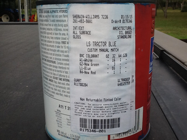 Before I started work on my grill guard, I took it over to Sherwin Williams and had them scan color. It's in their system as "LS Tractor Blue". Not sure if the recipes are in their National Computer System or not.