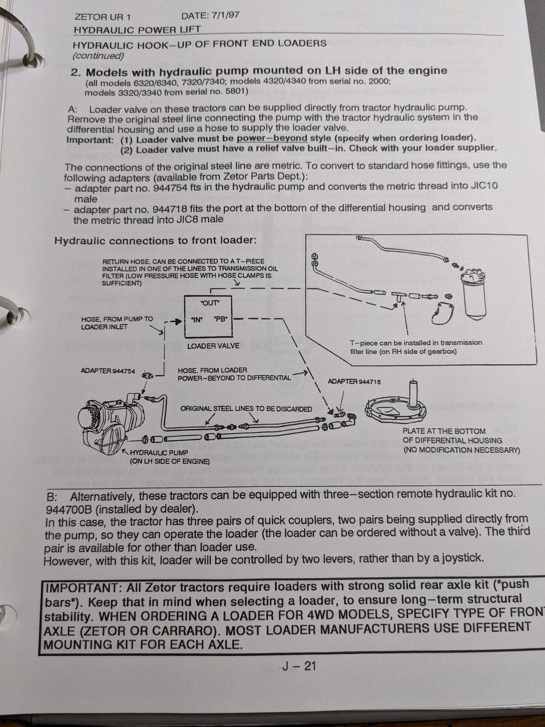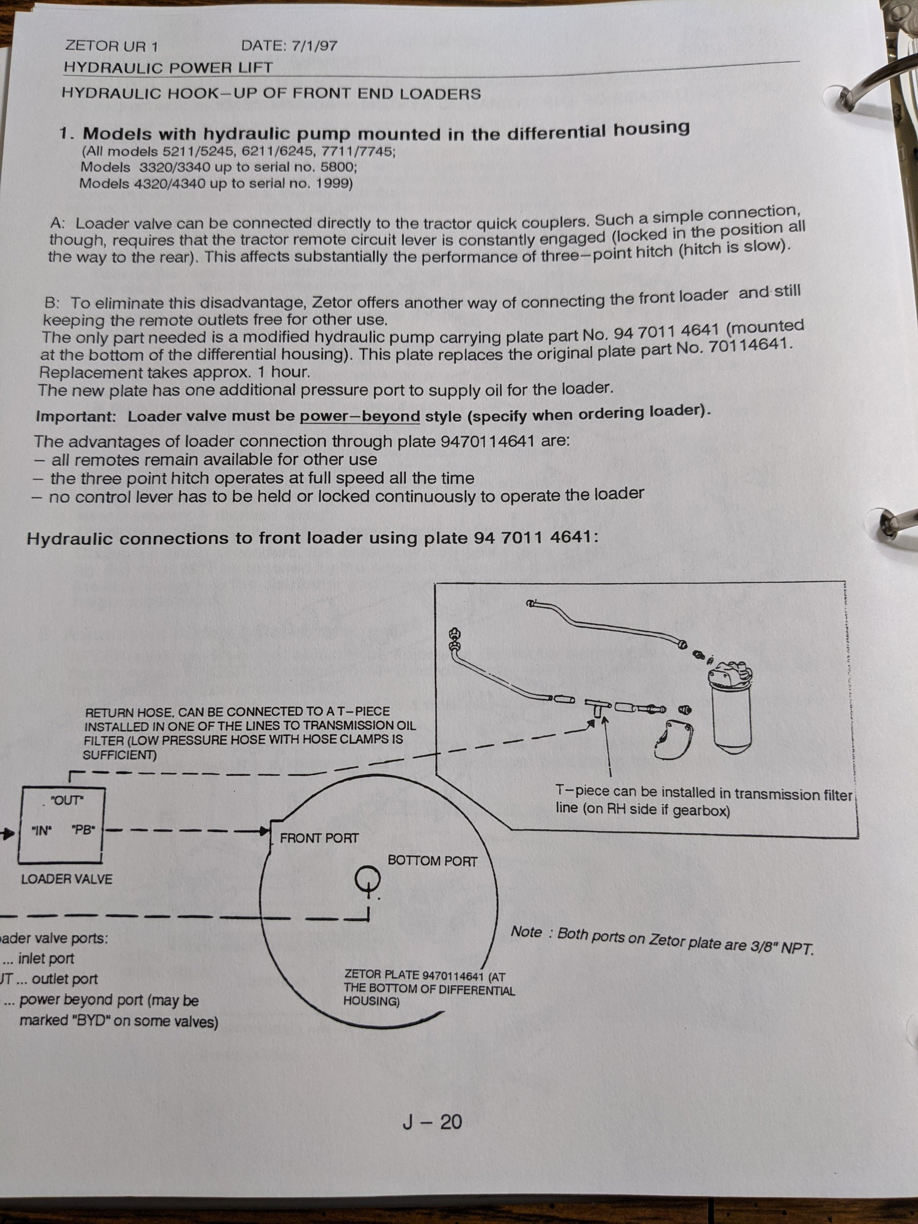 I could tie into the rear remotes - however then I lose those or have to install another valve and have to have that locked in the correct position. Am I missing something? I have thought about removing the top cover to really see inside, but I thought I would ask before I spent any more time re-inventing the wheel. And then where does it return to? In the manual it shows the rear remotes as having a "case drain" - zero restriction return on a quick attach, however mine doesn't have that. I wonder if it was removed, and if so if it is plumbed in 180 degrees from the filter output line?
