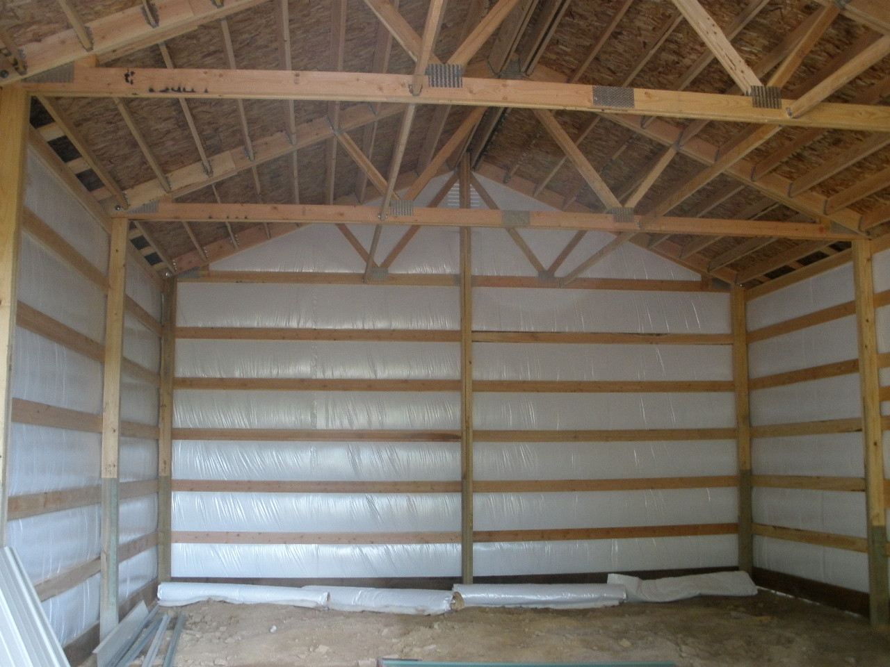 I had the blanket type insulation installed during the build. As you can see in the picture they left me quite a bit of insulation. Before I finished the interior I cut another layer of insulation and stapled it between the girts. Then I put osb on the bottom 8' of the walls and drywall above that. To finish off the insulation I had 6" of cellose blown into the attic space. Stays toasty when I am working, I have the thermostat set to 40 when I am not in the pole barn.