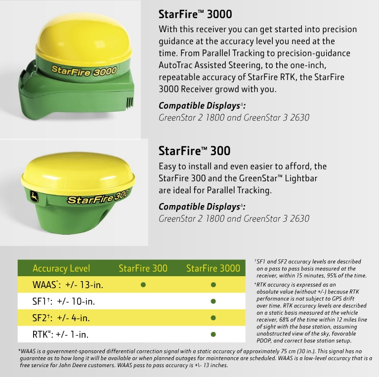 IIRC, the Deere system uses Differential GPS. They had a setup on display at Empire Farm Days last year and it used a base station, then sent signals to the receiver in the tractor, allowing it to see where it was better than just the standard GPS. I think they said that it was accurate to within a foot.