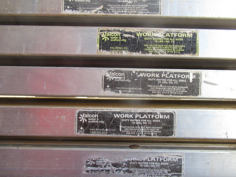 I got ladder style frames, so there are four levels that you can put a plank on each frame, and two levels where you can put three planks down and cover the entire floor. I bought three of the aluminum planks which I use for my main work areas. I also find it handy to have a bunch of 8' 2x12's as you can see in the picture to have a place to stand while going up and down, I don't like them for working from though. I put a piece of 1x2 on the end so they can't slip off.