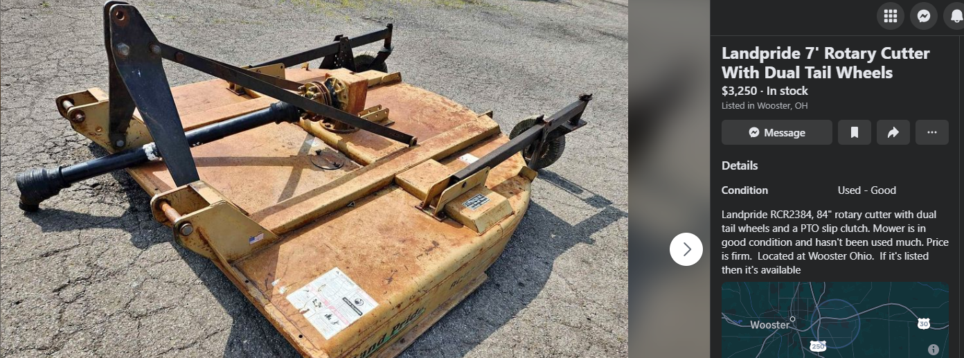 I haven't decided if I will keep my 5' cutter or not. I will probably list it for $1,600 firm and if it doesn't sell I'll keep it. It is a Landpride RCR1860 medium duty cutter in good shape and cuts very well.