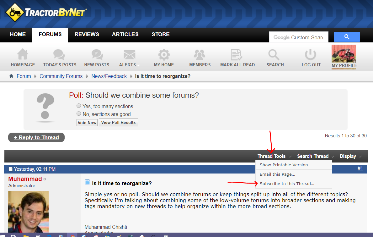 For new people, it's probably good to have a variety of topics. When I started, I wanted learn about the different brands, but after buying my tractor, I spent all of my time on here reading about ways to improve the land and building barns. If you where to reorganize, I think that there might be a way to focus more on those types of projects and getting them all together. I find what I like the most in the Projects, Rural Living and Build It Yourself areas. But like others have said, I first click on Todays Posts and scroll through for the green dots that I've already posted in and see if there is anything interesting in those threads first. They I scroll through the titles to see what catches my eye. Then I'll click on Projects, Rural Living and Build It Yourself for a closer look at what might be new that I missed. Rarely do I look anywhere else.