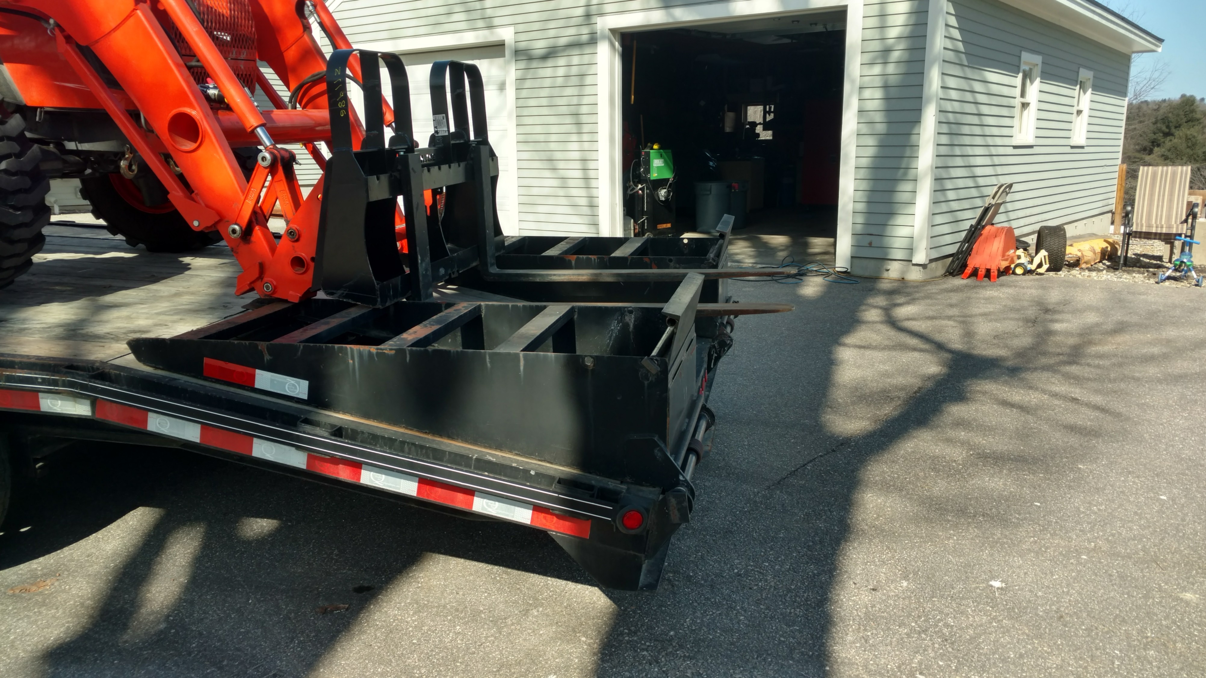I built a set of fork pockets for my trailer, works nice. As for the forks sticking out , I'd tie a flag on it and go with it.Semi-relivent... one of our trailers at work has box tubes welded under the deck so as to allow a set of forks to be inserted, disconnected and secured, without taking up deck space. Allows a skidsteer with bucket on the deck, forks on the side, one trip. Car hauler type trailer, fork backing plate/ssqa no wider than fenders. Slick.