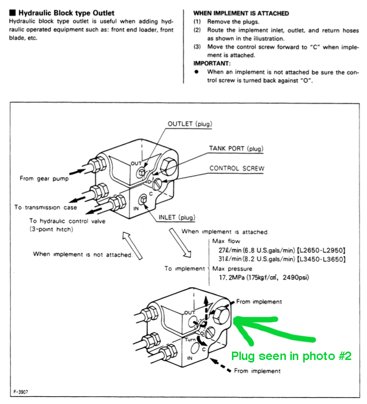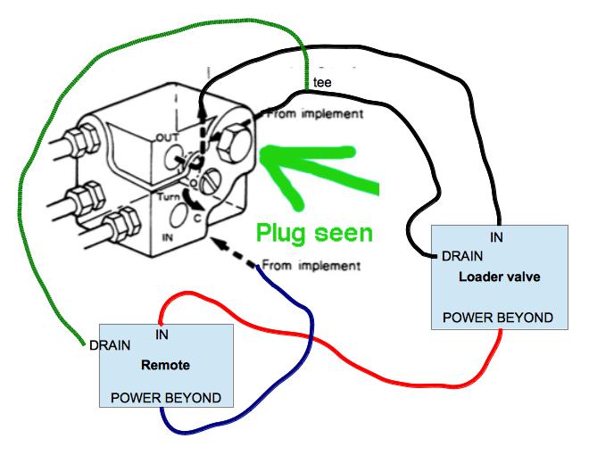 It can much more easily be added between the "OUT" on the hydraulic block and "IN" on the loader valve, or between the "power beyond" on the loader valve and the "in" on the hydraulic block. These are 3/8 NPT pipe threads connecting to hoses you can