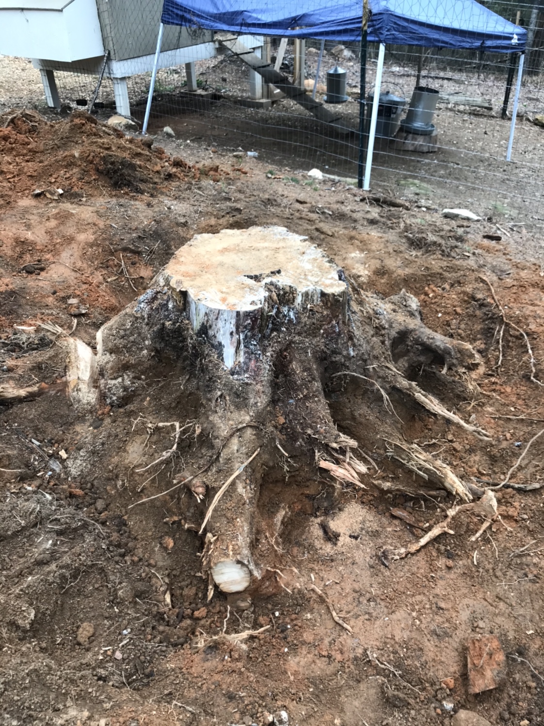 And here is the stump that I previously couldn’t pull out with 3:1 advantage using pulleys but popped out with 2:1 using my new gantry device: