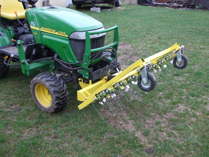 I wanted a front dethatcher for my 2305 so after looking around on TBN I put this together. I took a few ideas from several different styles. The nice part is that it comes off by just disconnecting the hydraulic lines and pulling out the one long 3/4" pin that goes through the frame.