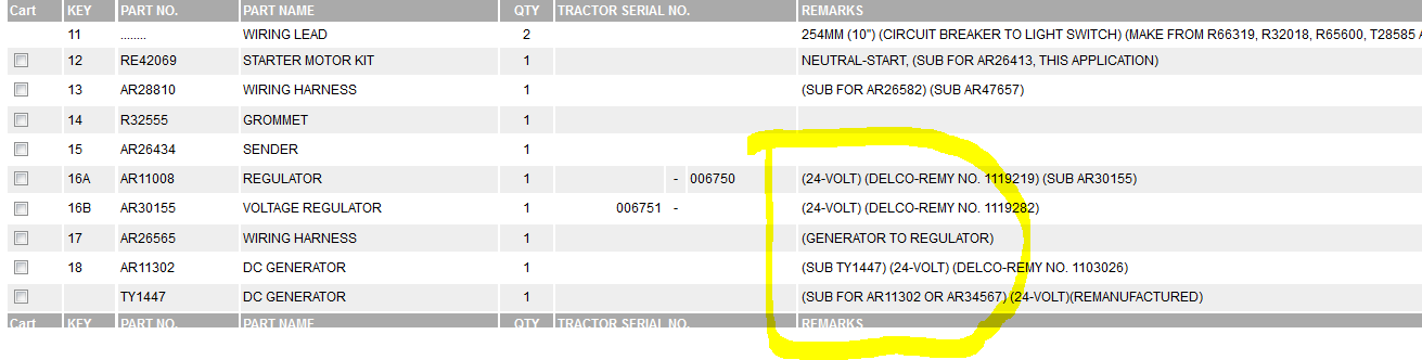 All I know is that if you want to repair the system you need to understand it. The generator has two separate 12 volt charging circuits in it. Both are controlled by one voltage regulator. If you add a load to one battery like a radio, or a fan for the cab, or a monitor for a round baler sooner or later you are going to have one dead battery. It was definatly an ingenious engineer that developed the system. What he forgot about was that over time a burnt out light bulb, some extra resistance somewhere, or accessory's would change the way the battery's needed to be charged. That's why John Deere came up with a change over kit. I just buy the starter and do the rest myself as the John Deere kits are pricey. A 12 volt 3020 starter on eBay used to be around the $200 mark.