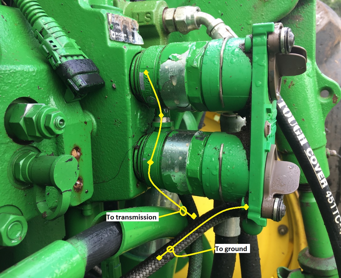 Then I tracked the hoses and found that the exterior (furthest away from cab) one went to ground, while the interior (closest to cab) hose was disconnected from the back of the hydraulic fill tube. I reconnected it: