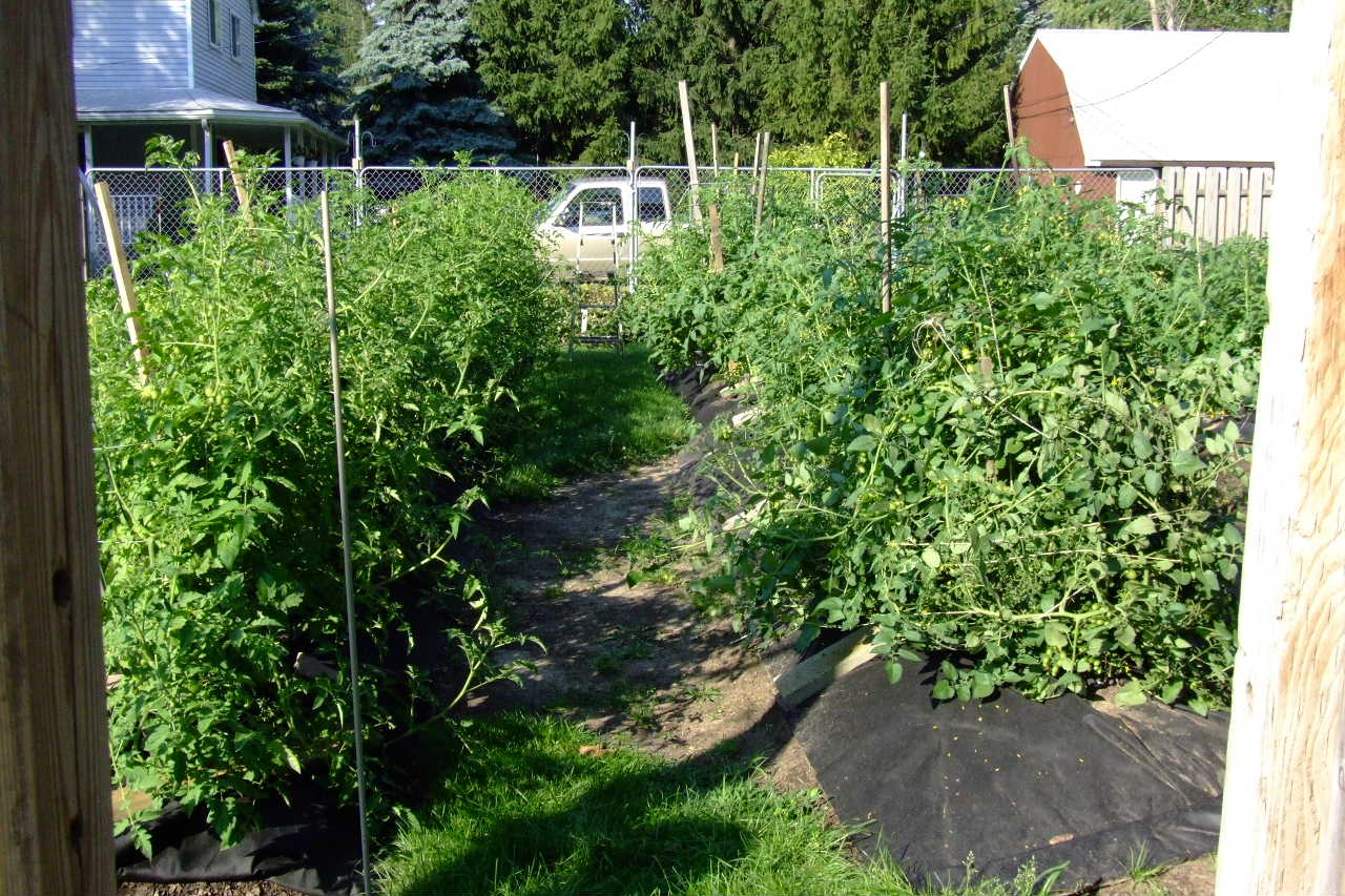I'm way behind in thinning/pruning. They do have quite a bit of fruit on them. With the heavy rain I've been re-staking and tying the plants back upright. I need about 40 or so more of those great cattle panel tomato cages.