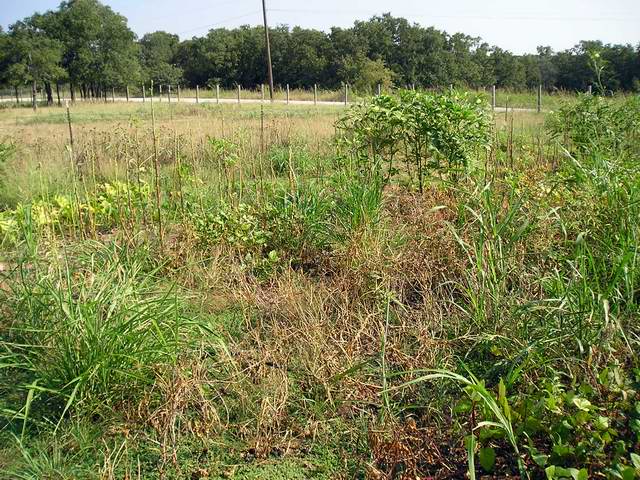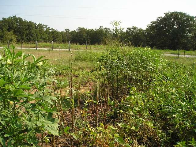 Bird, as Harvey can attest, it's not quite the jungle it appears to be. It is certainly grassy around the edges where the old plants have died off and the Johnson grass is clustered about. Yet, this morning we picked over 10 lb of tomatoes, several squash, and about 3 lb of okra. Tomorrow morning I expect to pick a half-bushel of peas. We aren't quite yet ready to mow it under. Next year I'm going back to wide-spaced rows. I can maintain those better.