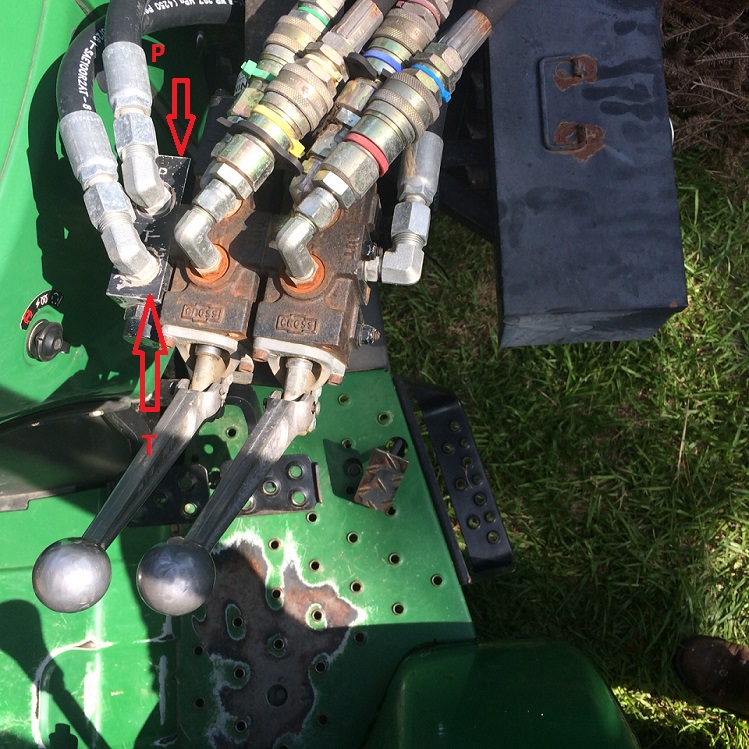 The P and T on that block to the left stand for pressure, and tank. And the hose coming off the right side of the second valve, would be the power beyond. Since that is a stack type valve......where that hose is connected could be more valves in the stack.