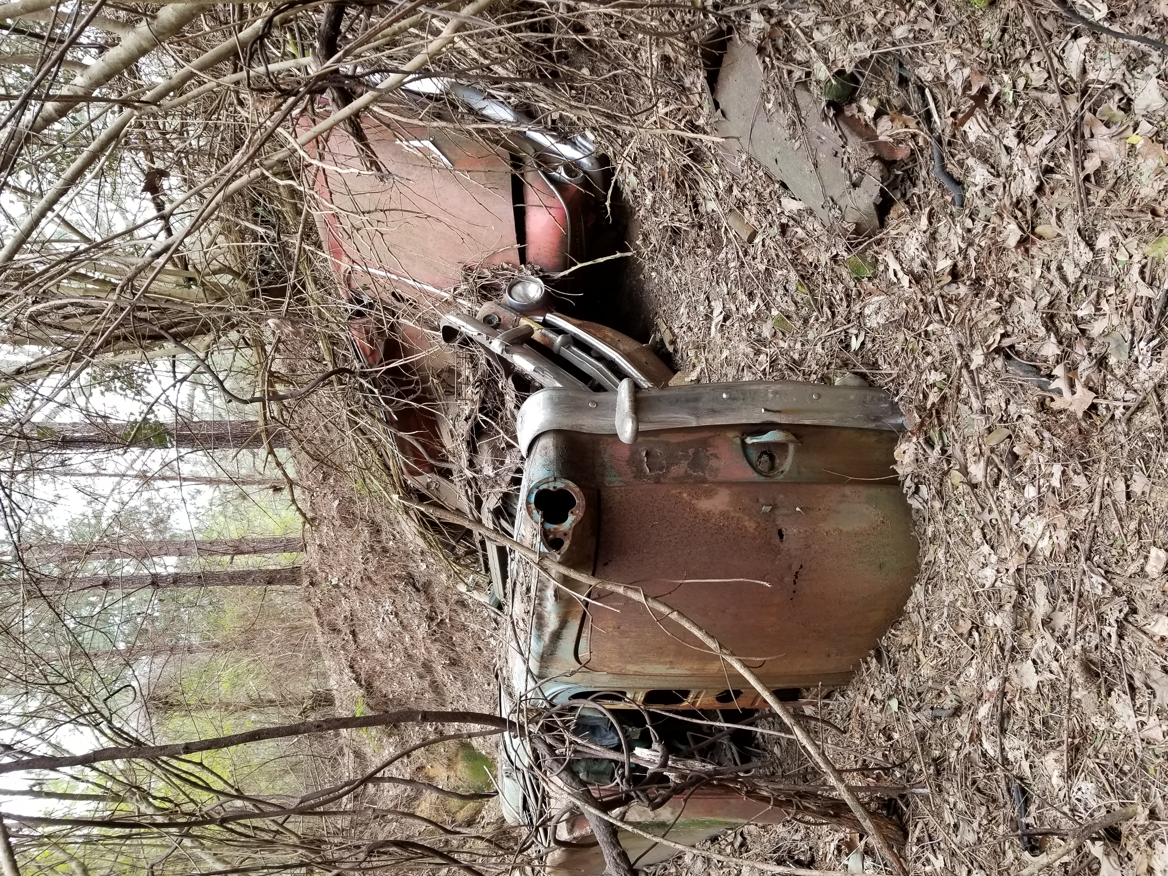 I've been hunting the same property for 5 years now, it's about 125 acres and I really haven't walked the entire property yet. Most of it is in planted pines with lots of hollows and big mature oaks that were untouched during the clearcut some years ago. There are also lots of gulley's and ravines throughout this property. Last Saturday I was walking around there and came across a gulley I hadn't seen before, and when I looked down into it, to my surprise there were three old cars lying in it. There was a 1954 Plymouth, a 1955 Chevy Belair 2 dr HT, and a 1958 Chevy Belair 2 dr HT in the gulley. These cars are roached out, but man, 20 years ago it might have been worth the effort to try and retrieve them, but now it would take an act of congress and a Sikorsky helo to airlift them out. The Plymouth still has the motor and tranny in it, but the two chevy's don't have motors. The Plymouth is the one upside down. Hard to see it in the picture, but it looks like in the past that coyotes have used the area between the Plymouth and the red Belair as a den. It forms a tunnel in between them, and the dirt inside it looks hardpacked and worn, and there are some trails going up the sides of the gulley. Thought some of you might enjoy the story.