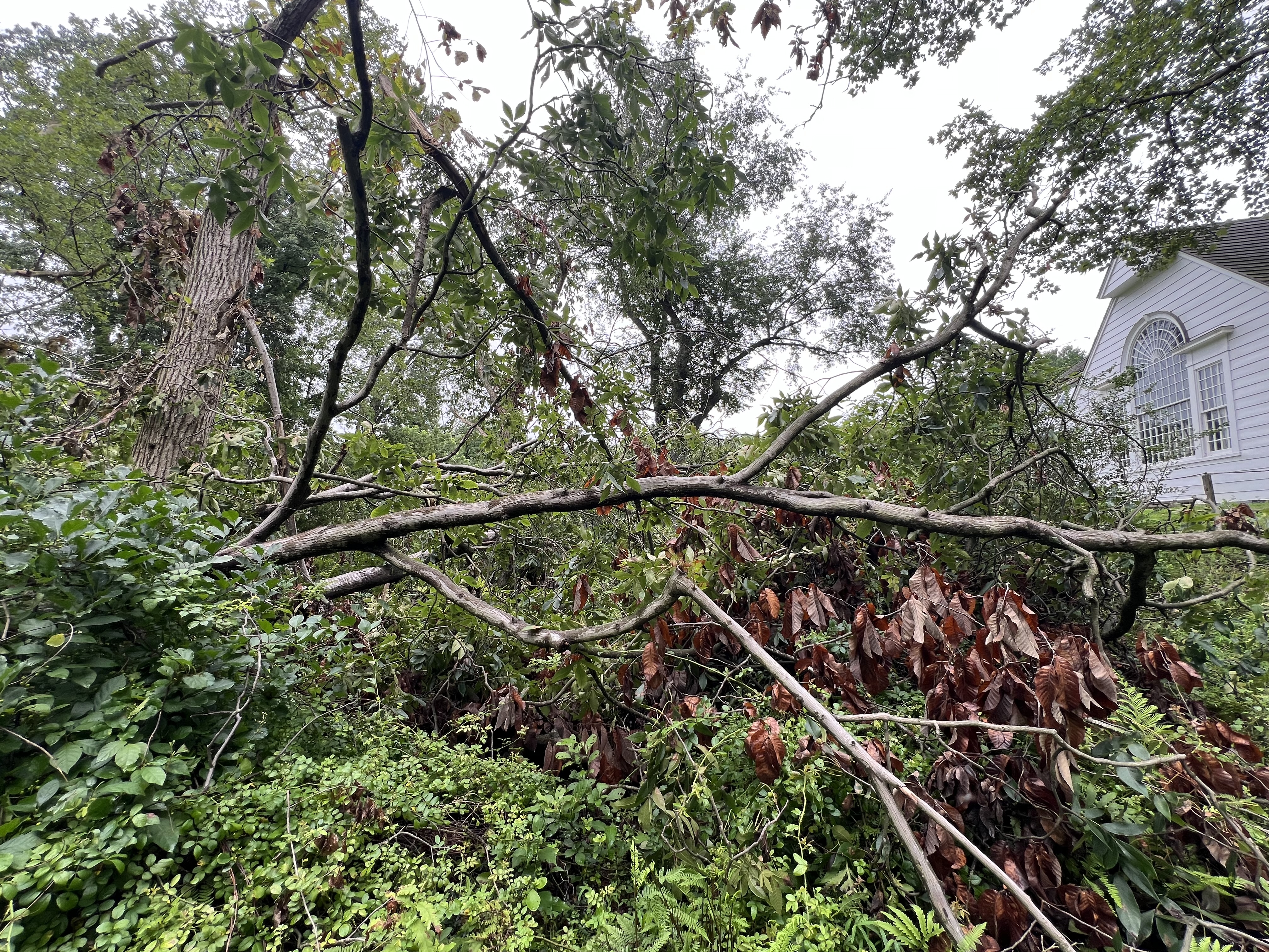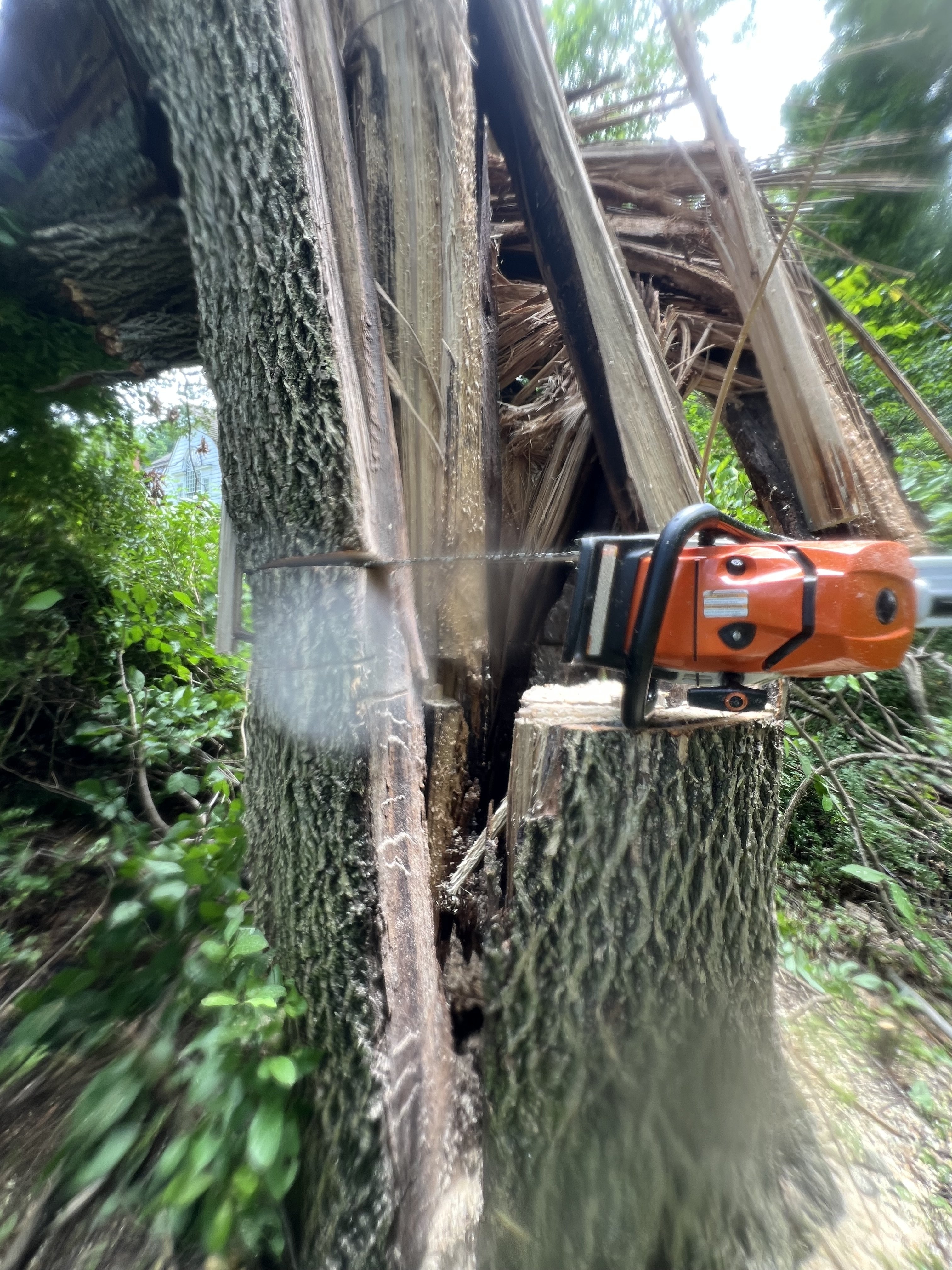 This week we cut up fallen trees wrapped in vines & stickers. Yellow jackets buzzing around, and of course 90 degrees and 90% humidity.