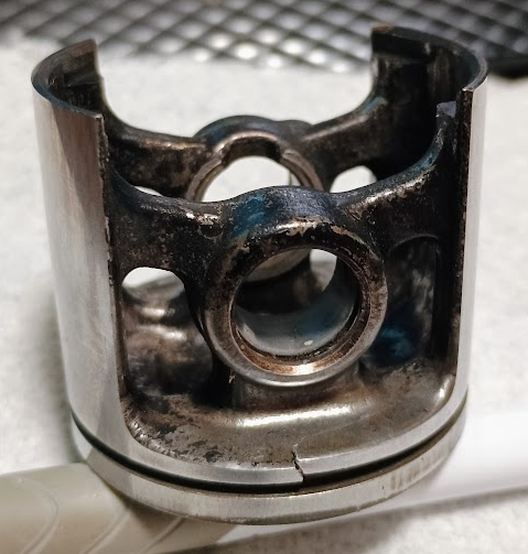 SIL bought a non running Husq. 254 that 'ran when parked' for $100 with a never used 20" bar and chain. It apparently sat for a couple years so figured the carb was gummed up. He couldn't start it so got me to have a gander, zero compression, nothing so figured the cylinder/piston would be scored to death, nope lot of regular engine oil was in the cylinder tho so some one was trying to up compression. I figured the piston would have an access hole in the top when I took it apart, nope, busted ring land. Dunno how you'd ever bust that unless it did a good backfire on the wrong stroke or bad casting maybe.