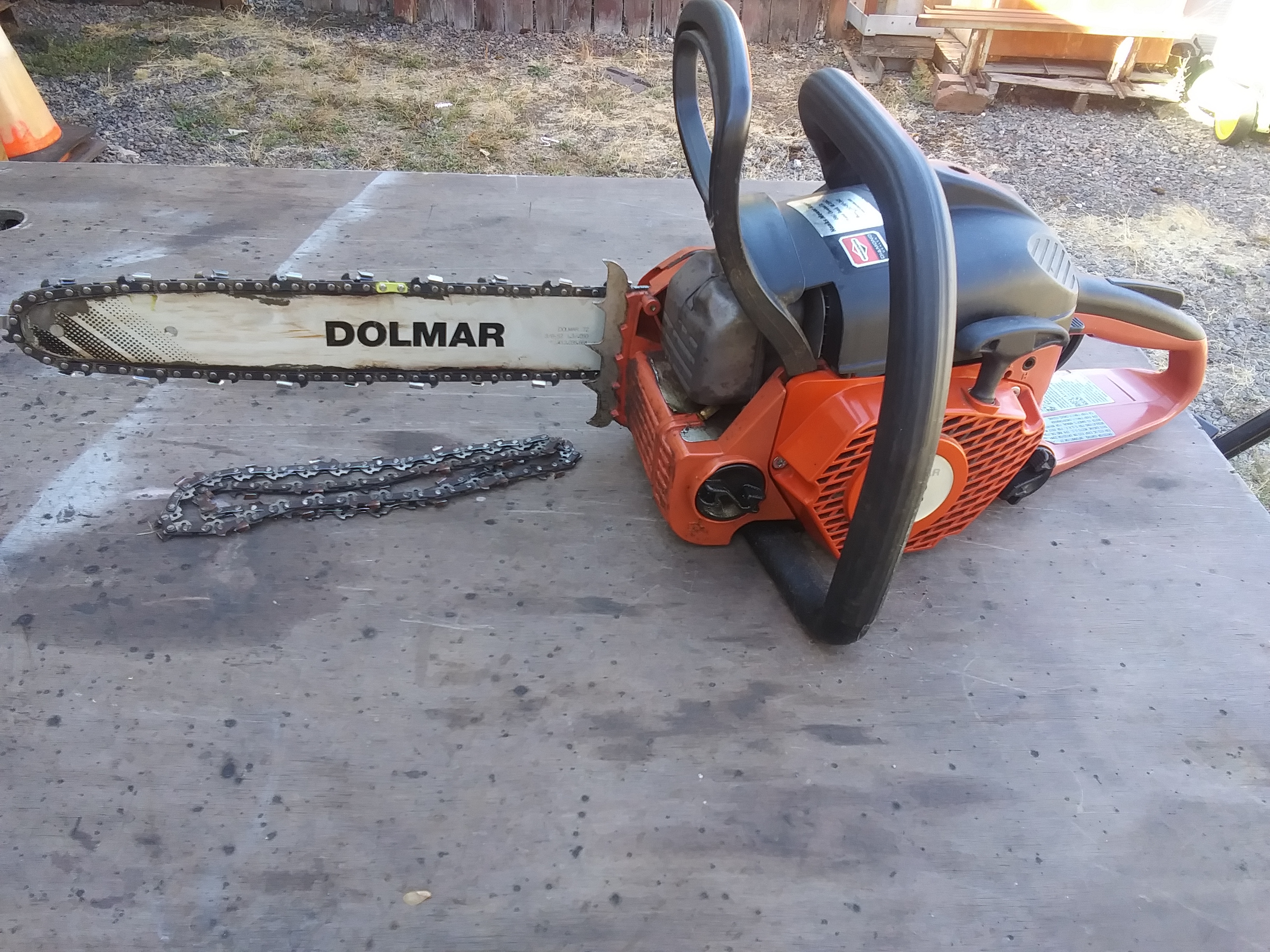 Some time ago a neighbor dropped off a saw that he was tired of fussing with, finally got around to looking at it. Stripped the bar and covers to look / clean things, the only obvious problem I could see was that the snap in primer bulb was missing. Since I needed one a while back, I order a lot on ebay as 8 was about the same price as one here in the stores. Popped it in and it fired right up and ran nice, might need to set the idle up a bit is all. Nice little Dolmar 32 with a new chain and sharpened serviceable one.