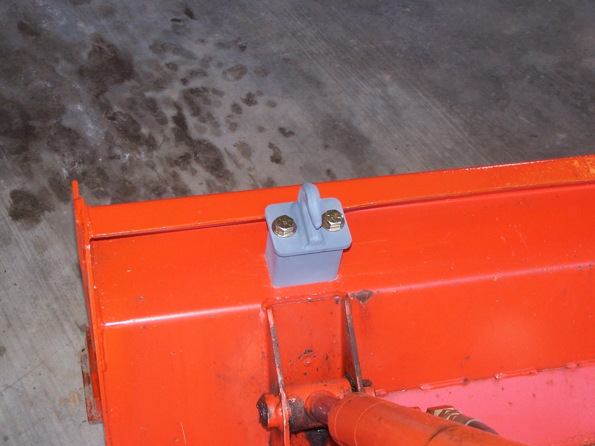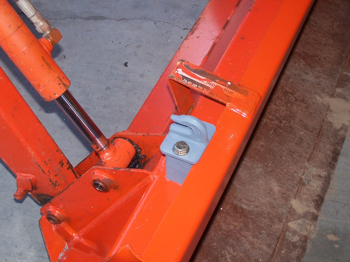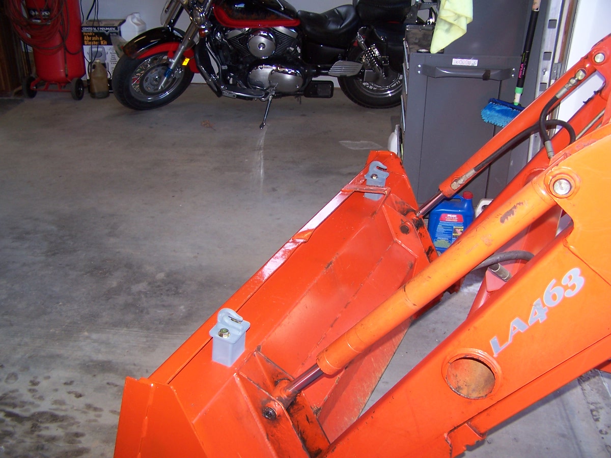 My hooks arrived today! The installation took about 1 hour. The critical step (for a Kubota installation at least) is where you use the 3/8" bit with the drill guide to mark the holes on the bucket. My first hook went on just fine, the second one took a few "field adjustments" to get it to line up properly. Pics attached, all I need to do now is wait for a warm day to paint the hooks. Thanks Ken!