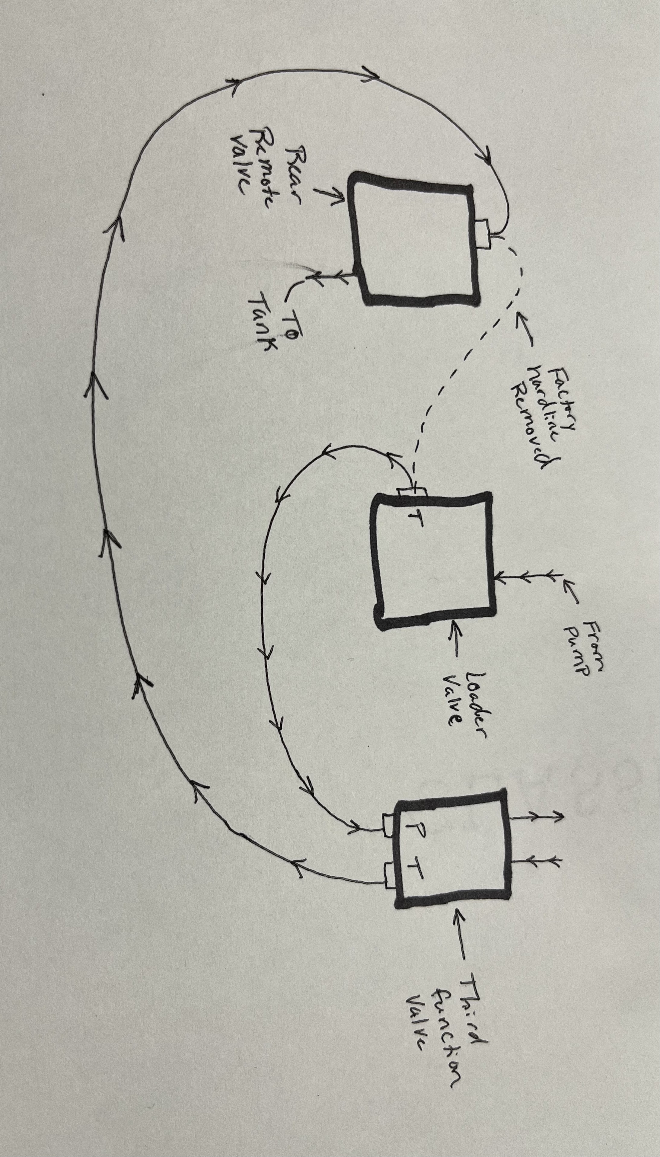 I have attached a diagram that I drew showing how I plumbed the kit in. What I did is remove the factory hard line going from the port labeled “T” on the loader valve that goes into one of the top ports of the rear remote valve, basically putting the third function valve in series. I explained to the service guy at my local dealer how I installed it and he assured me that that I had it plumbed correctly and suggested an issue with the third function valve not allowing enough fluid to flow through. To test this theory I put quick couplings on the two hoses going to the third function so that I could couple them together and create a loop taking the third function out of the equation. By doing this the backhoe picked a little bit of speed (not much) but it still lacks power. I suspect that the distance of hose is not able to carry the volume of hydraulic fluid that the short hardline can.