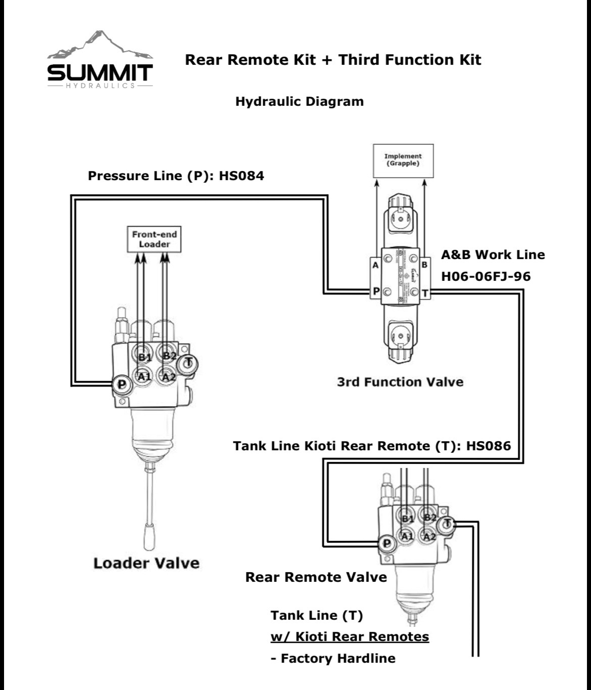 I have a 2021 Kioti CK3510HST with factory rear remote hydraulics installed to run a backhoe. I decided to add a third function kit to the front end loader to run a grapple. I went with a third function kit from Summit Hydraulics. The kit runs the grapple just fine but the problem is that I lost the majority of my hydraulics to the backhoe after installing the kit. The backhoe operates extremely slowly and lacks power (the outriggers won’t even lift the tractor anymore).