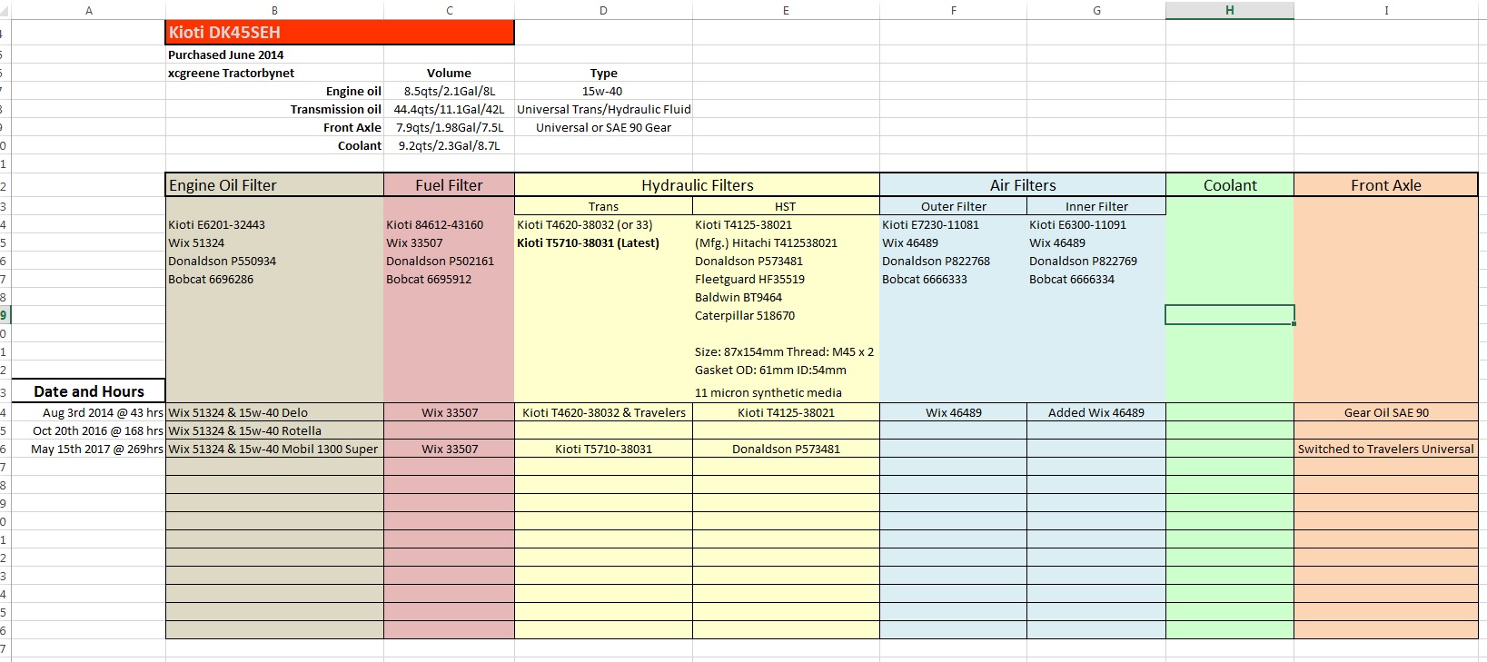 Just plug in the kioti number, and it will tell you that Hitachi is the manufacturer of the filter along with Hitachi's cross reference #T412538021 and fleetguard #HF35519. With those two numbers you can cross reference to the others I've listed on the spreadsheet through their respective websites. The Donaldson filter seems to be the easiest to find and purchase, and they are a reputable company.