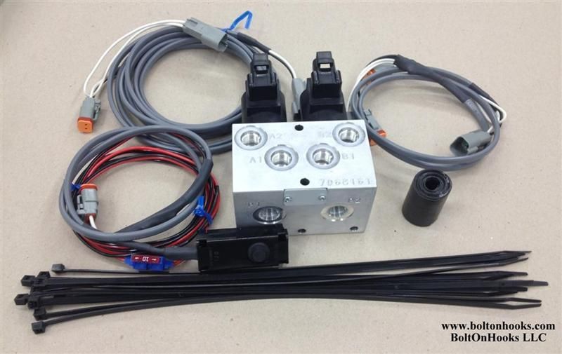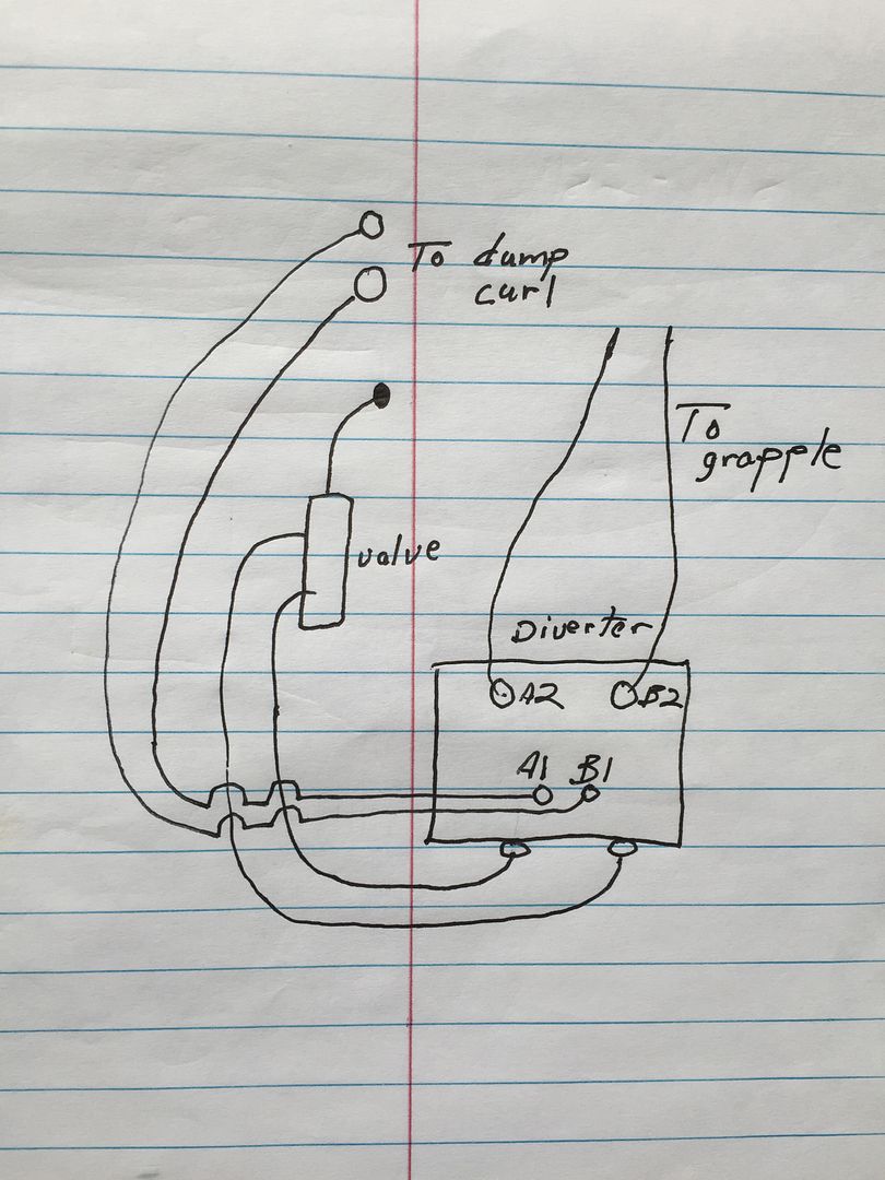 According to the instructions which came with the diverter, P1 and P2 flows directly to A1 and B1 and operates the bucket's curl and dump as if the diverter wasn't even there. When the diverter coil is energized by the button on the joystick, the fluid is routed to A2 and B2. That fluid path is what opens and closes the grapple.