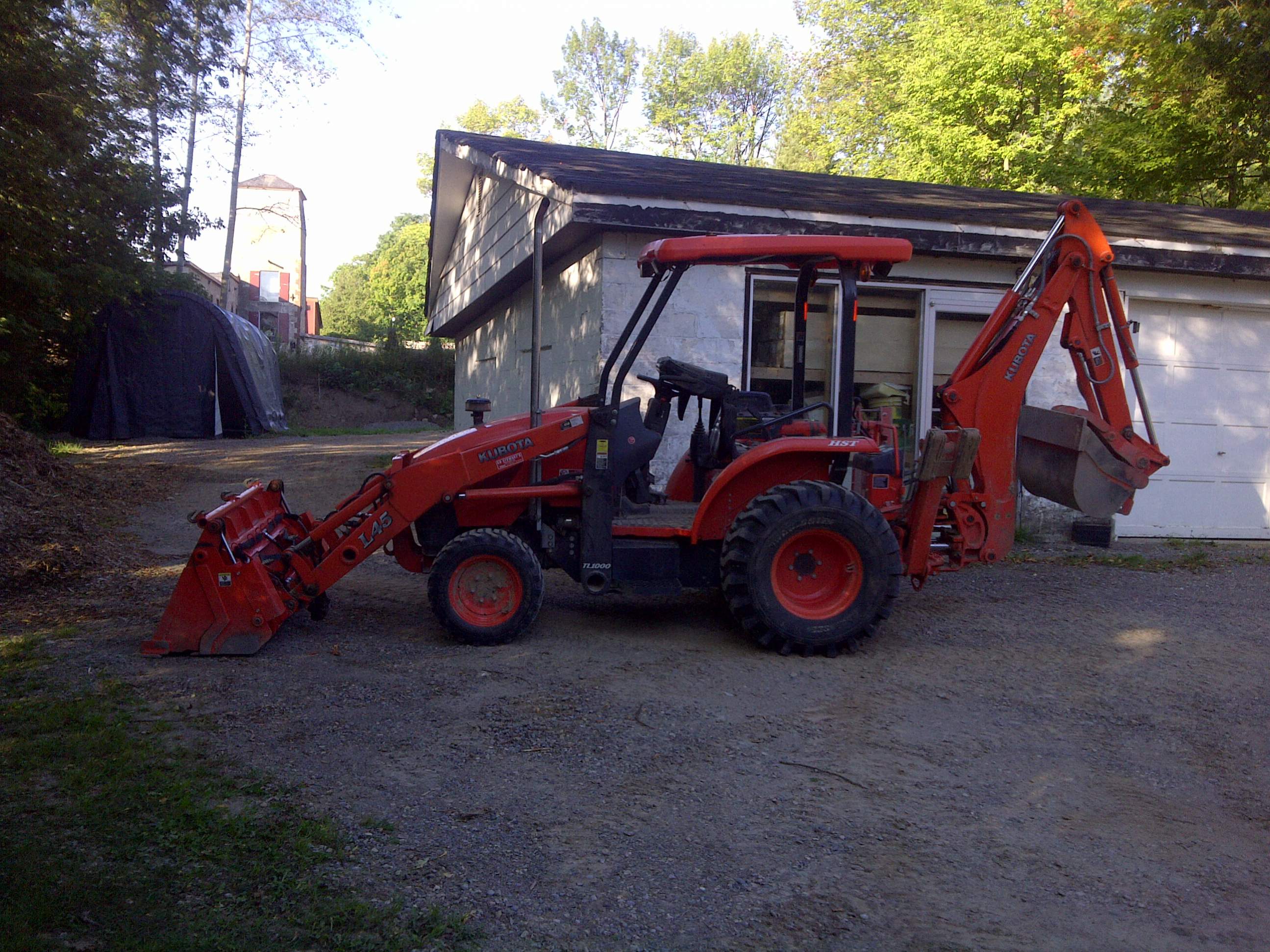 Driving around normally I could live with the exhaust discharging by the front tire but this year it has been so dry that every time I stepped on the HST pedal with the auto throttle on the L45 it would send up a cloud of dust. The low exhaust is also a problem when you are working the machine around a trench or other excavation that has other workers in it. If they are down 3 or 4 feet when you drive by they get the exhaust and/or dust blown in their faces too. The worst problem I have encounter with the low exhaust is if you are excavating along a building which is what I do when fixing leaky basements. I would always try and orient the machine so that the exhaust is blowing away from the building but there are times when you just can't do that with a TLB. Believe me if you are sitting on an open station working backhoe controls for several hours with the exhaust blowing against the building you will be breathing diesel fumes all day. I don't mind a wiff of diesel but all day is too much for me.