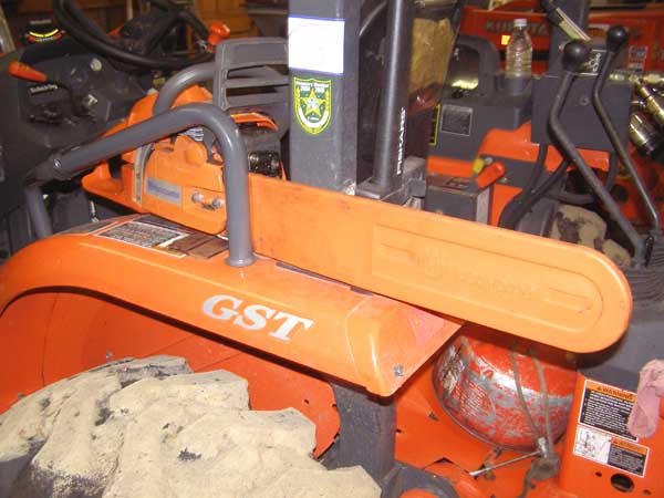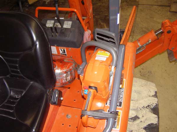 Then I just set the chainsaw up against the grab rail with the chain bar cover slipped rearward between the ROPS and the handgrab bar. Then just take a rubber tie-down stretch with grab hooks on each end and wrap that around the chainsaw handle (pointing toward the steering wheel) and the grab bar.