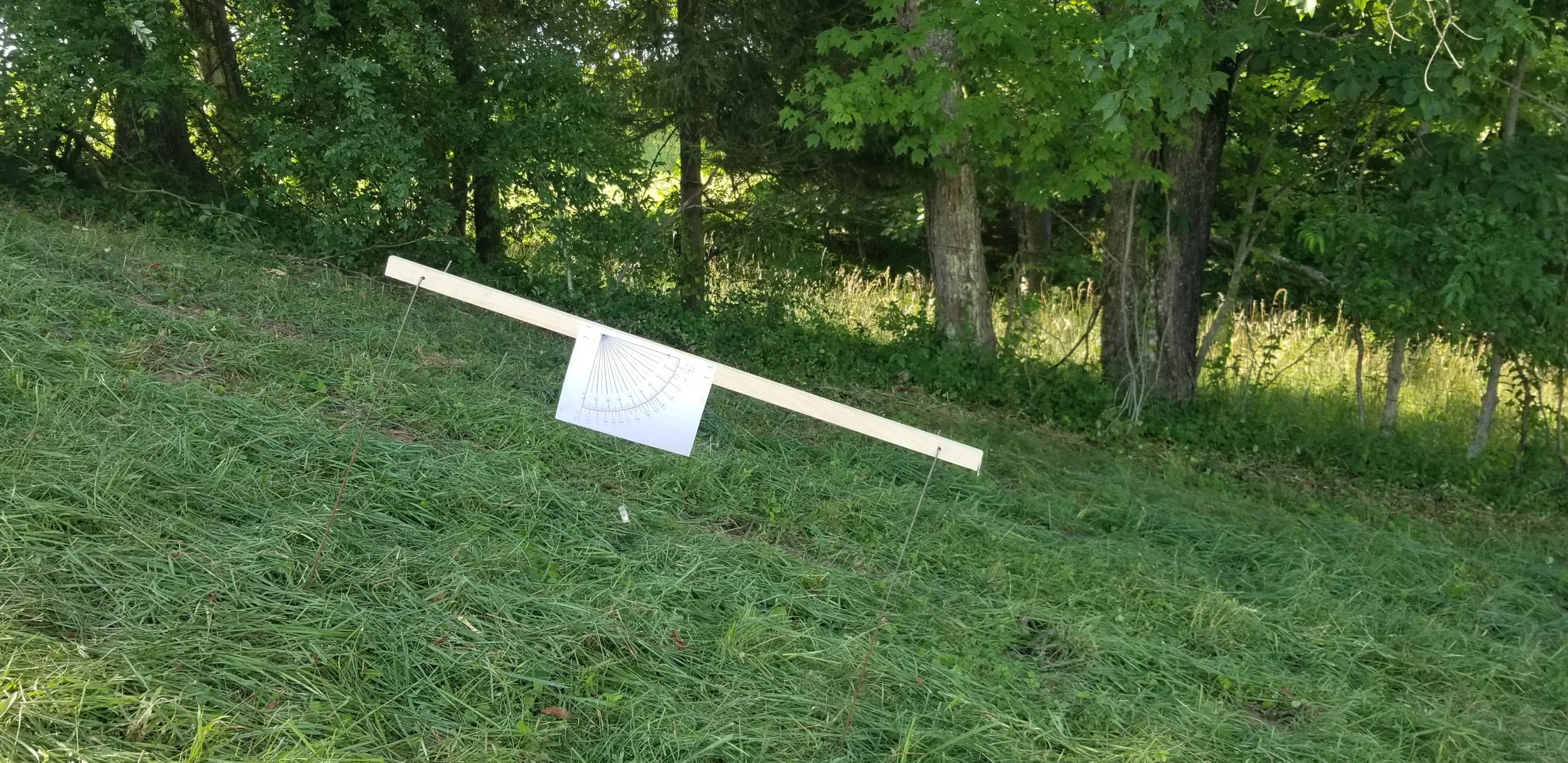 I built a crude measuring device using a 1x2 piece of lumber, a printed chart of slope angles and a thread with weight dangling from the thread to measure the slope. I use a piece of stiff wire in each end of the 1x2 in order to stick the gadget in the ground standing on it's own while I satisfy myself that the 1x2 is parallel to the slope. Sorry for the low quality photo.