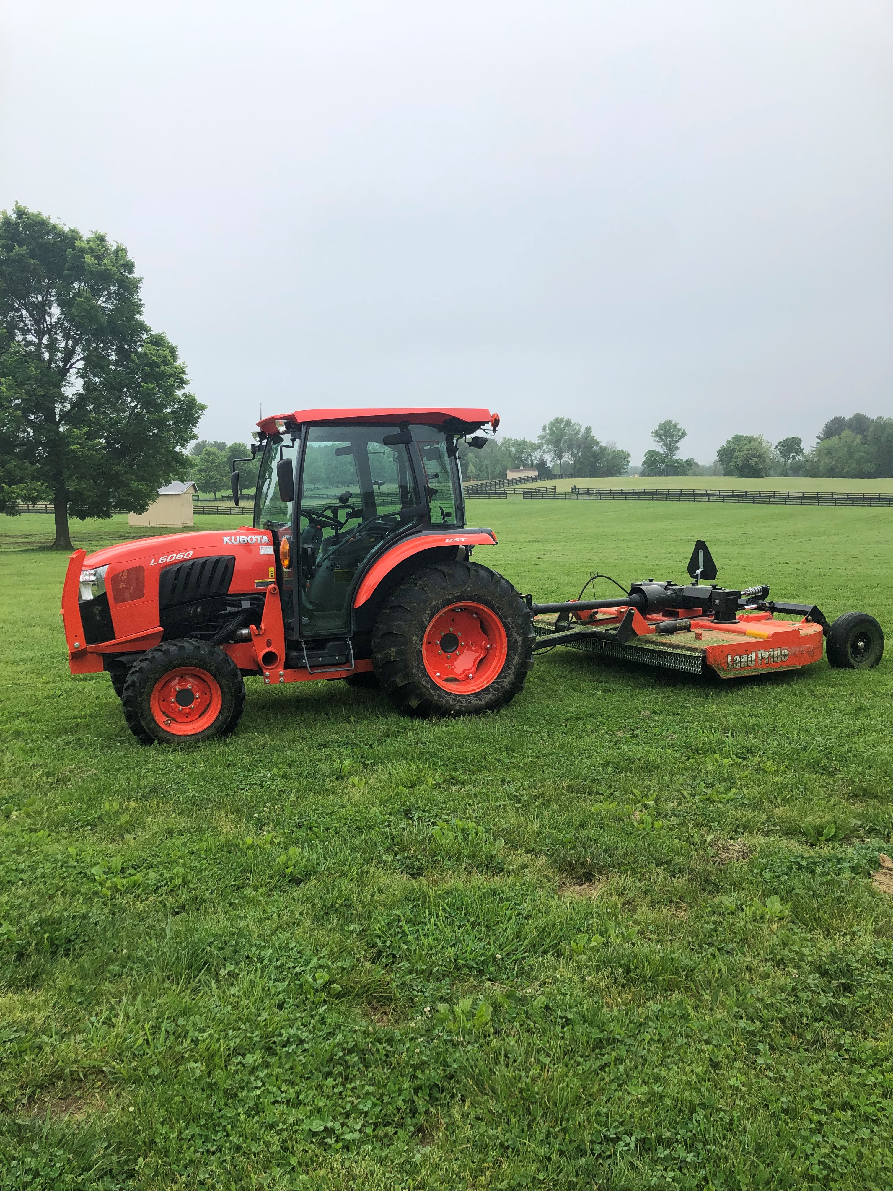 L5740 4WD hst w/FEL using a 1600 lb twin spindle 8 ft pull type rotary cutter.