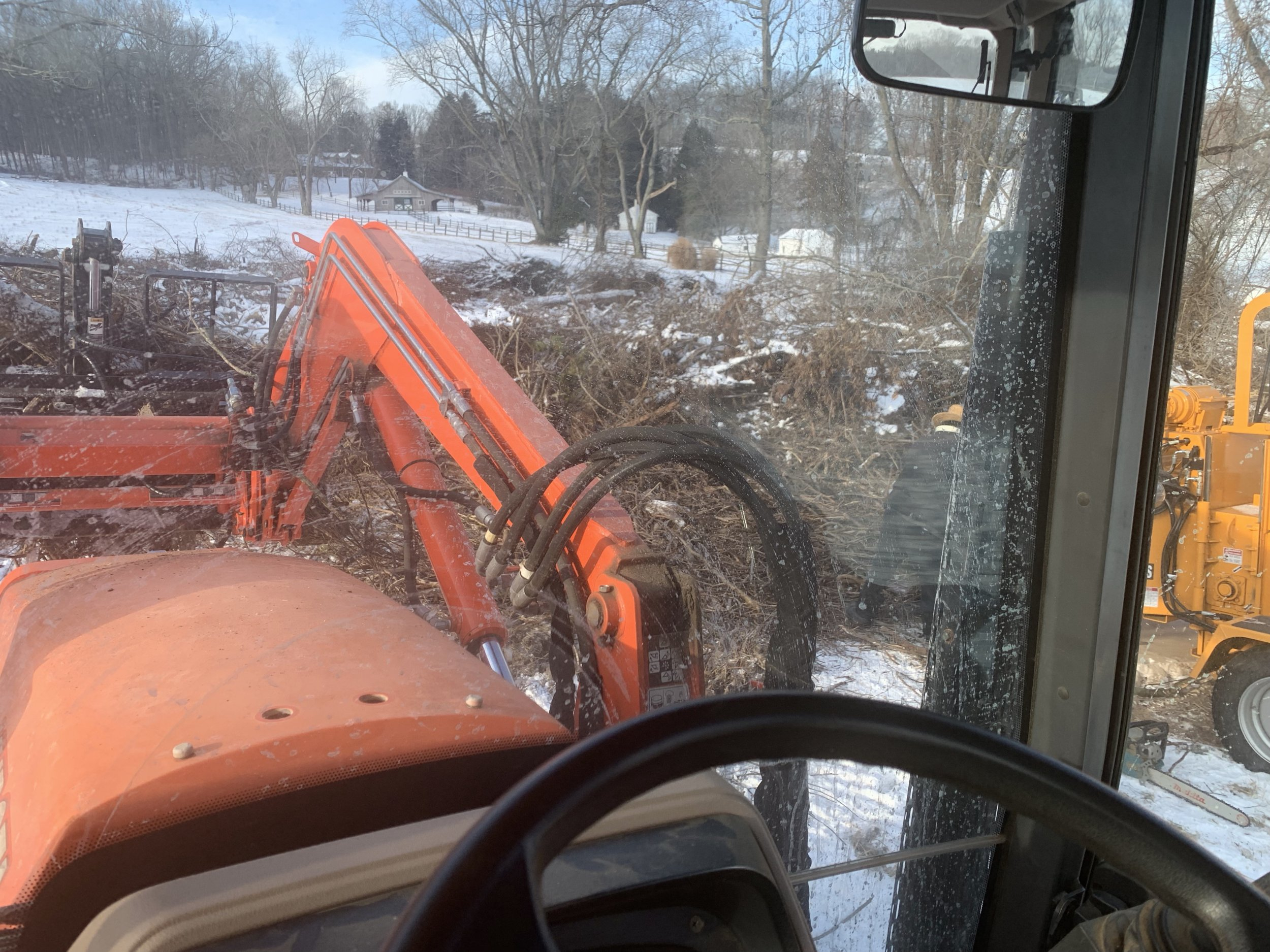 Here’s a view looking in the opposite direction. All the brush was tangled, from years of criss-crossing the material into a big tangled mess. My helpers, who have been with me for years feed the chipper, while I used the M135X and single arm log grapple to pull the brush out into manageable clumps. One clump could be stickers & vines, the next could be a 14” log.