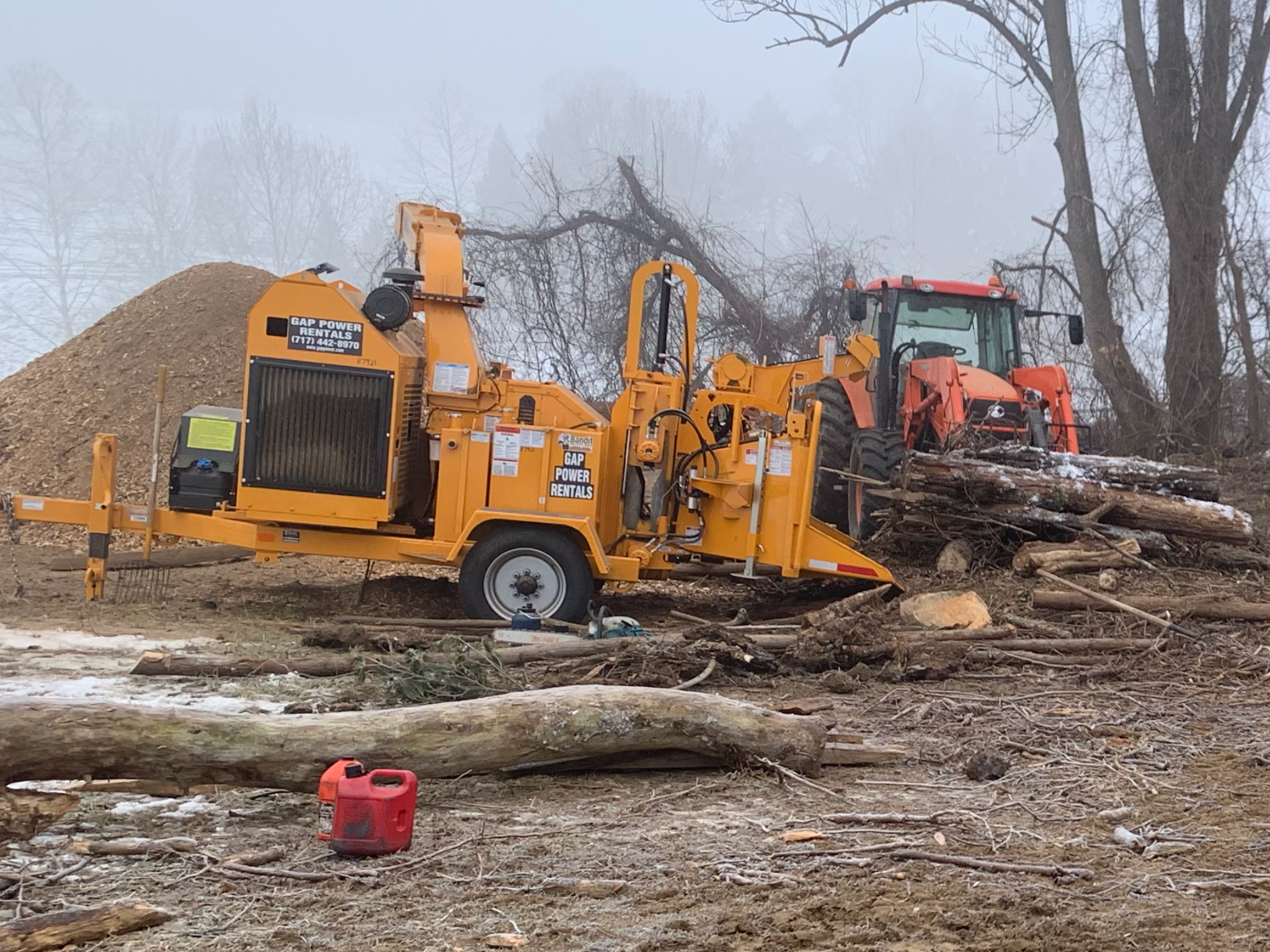 Another view early AM, making real good progress. In the middle of the pile is a ravine. They first started by filling the ravine with logs, limbs and brush. That material is too far gone to chip, so the customer agreed to leave in the ravine and let nature turn it to soil.