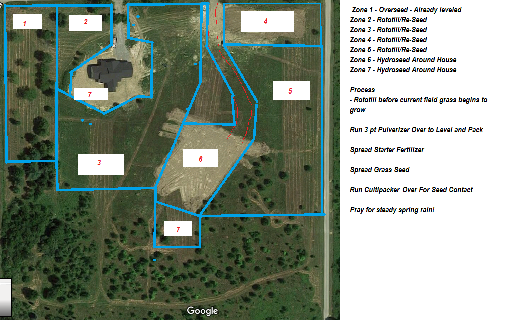 Plan is to rototill each (zone) and run a pulverizer over it to level and firm once tilled. Next would be starter fertilizer, broadcast seed, and hit it again with the cultipacker or maybe the pulverizer again?