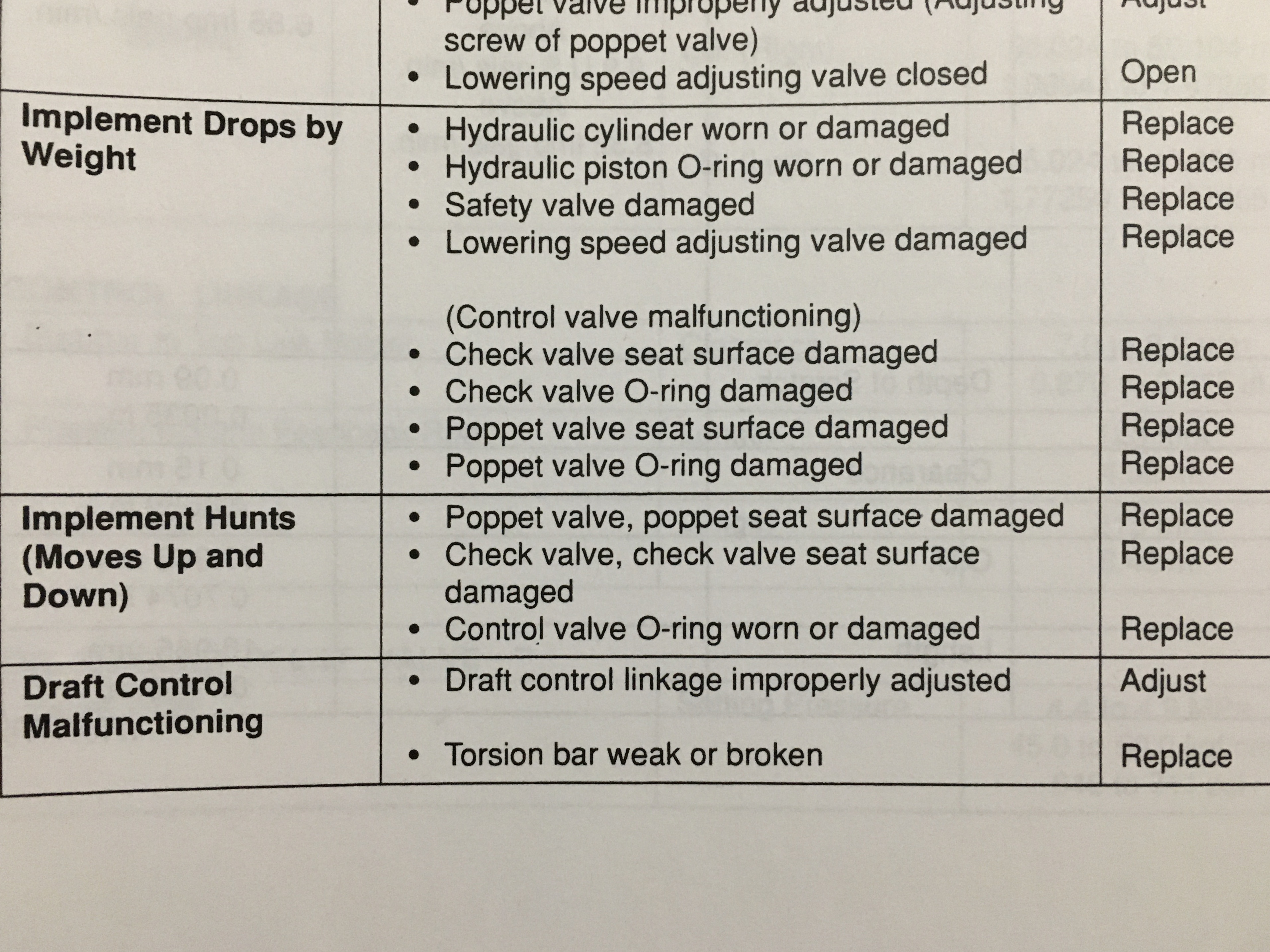 The only consistent thing I'm seeing is that if I shut the tractor down when it's carrying a 3PH implement, it takes about one minute for the implement to sink to the ground. That in itself doesn't bother me, because I don't want to do that. It's just a symptom.