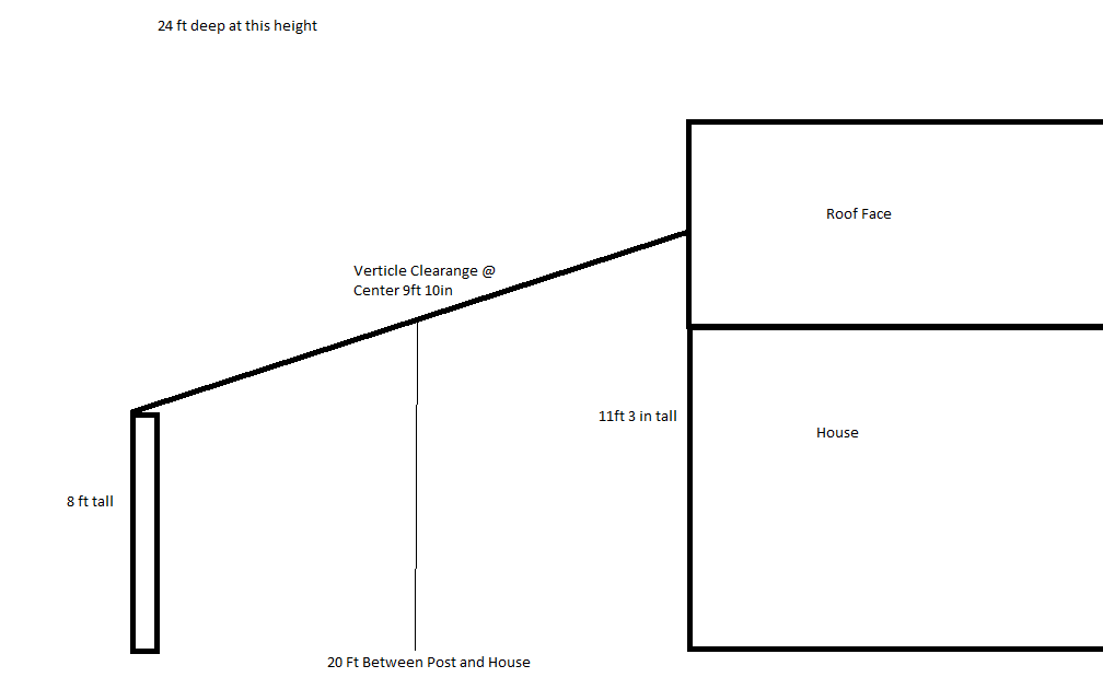 So in these very basic, and not to scale, drawings you can see the lean to shed from one plane. The length or depth of the shed is dependent on the height because of the roof overhang that i'm working with. The taller the shed is the narrower the roof line is. I don't want to go any less than 24 ft long/deep. Obviouisly I can go shorter and gain more length. But is 9ft tall with a 2/12 pitch and 5'5" at the post end TOO short?