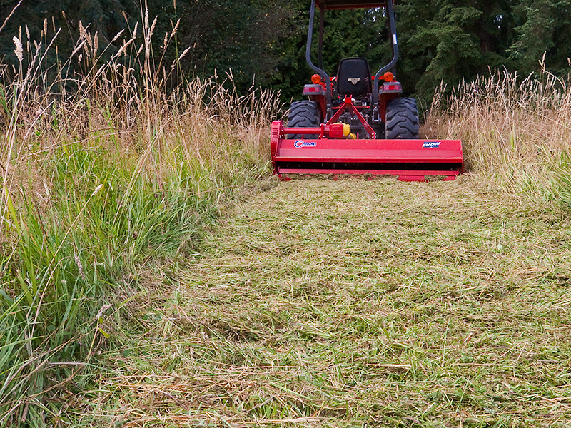 In 3rd gear (2500 tractor rpm, 540 PTO rpm) my tractor ground speed is rated at 1.85 mph.  There was no problem mowing 3 ft tall grass (3 inch cutting height) that was planted last fall and not touched since.  But note that I am mowing grass and weeds, not brush and rocks.