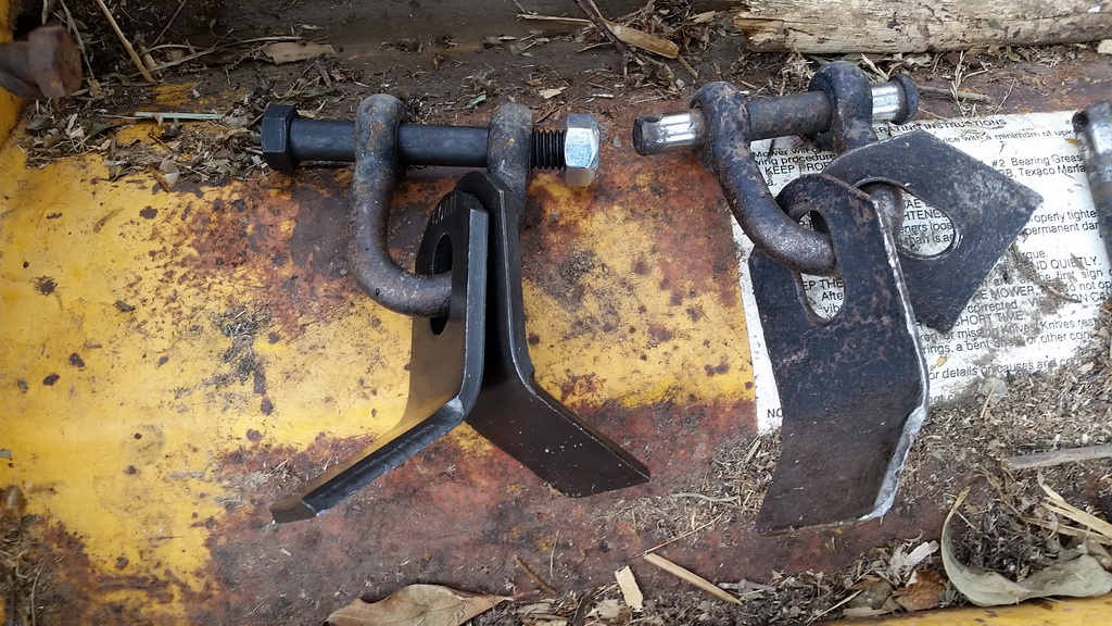 Interesting picture there as the D ring mount might allow the two blades to "hydrofoil" out (spread apart from each other) as leonz said. Mine are rigidly mounted, which makes little sense to me as you have the wide 3/8" or so flat where the upper parts are together that just rips at the grass. Even if the blades were sharpened all the way up that wouldn't really become a cutting edge with them pressed together. I'd rather see something like one of these with all edges sharpened...