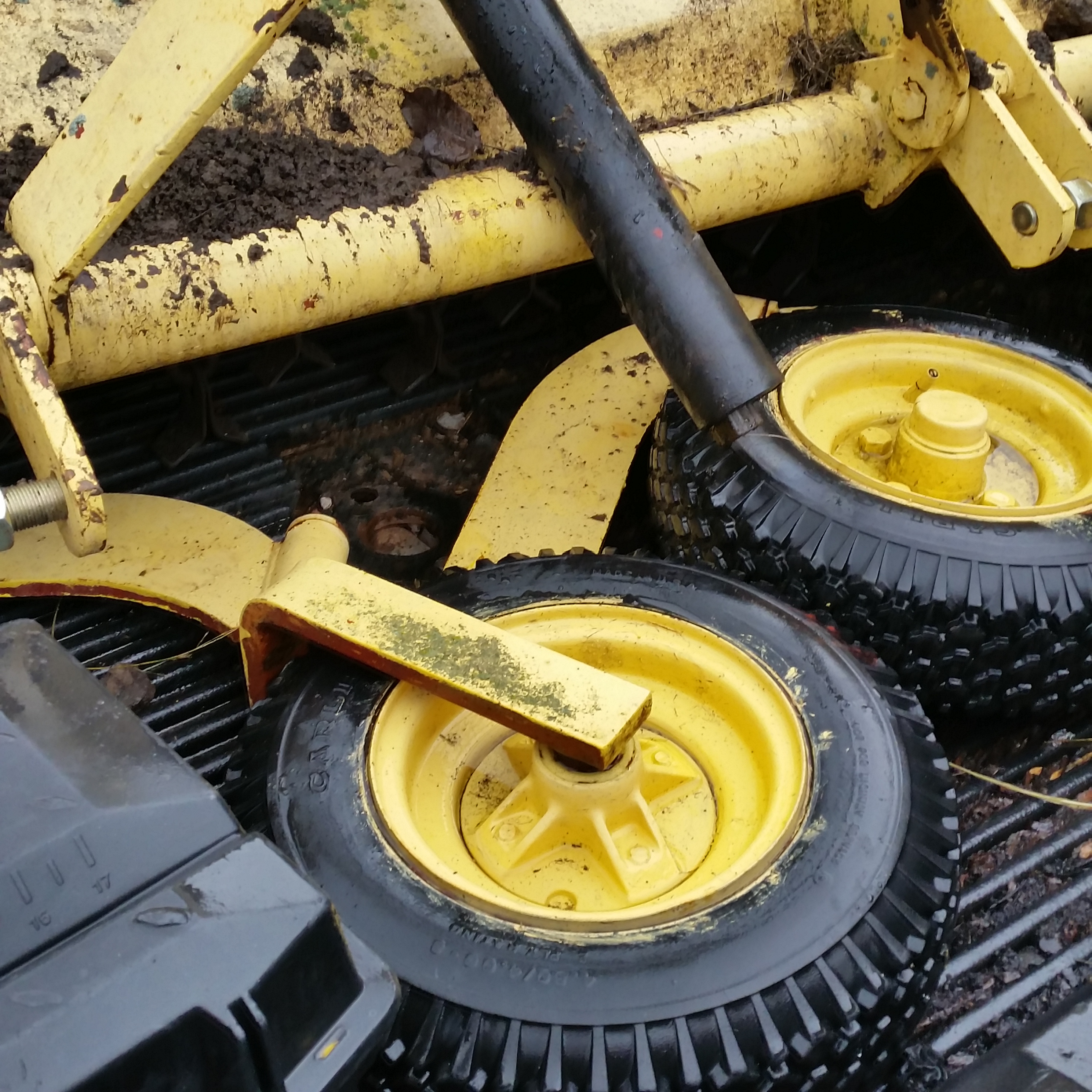 You have an "original" Mott Interstater finish mower with side slicer knives and gauge wheels to prevent scalping. Put the caster wheels on, grease the stub shafts for caster wheels, Take the V belt cover off and clean off all the grease and rubber dust to expose any buried grease fittings.