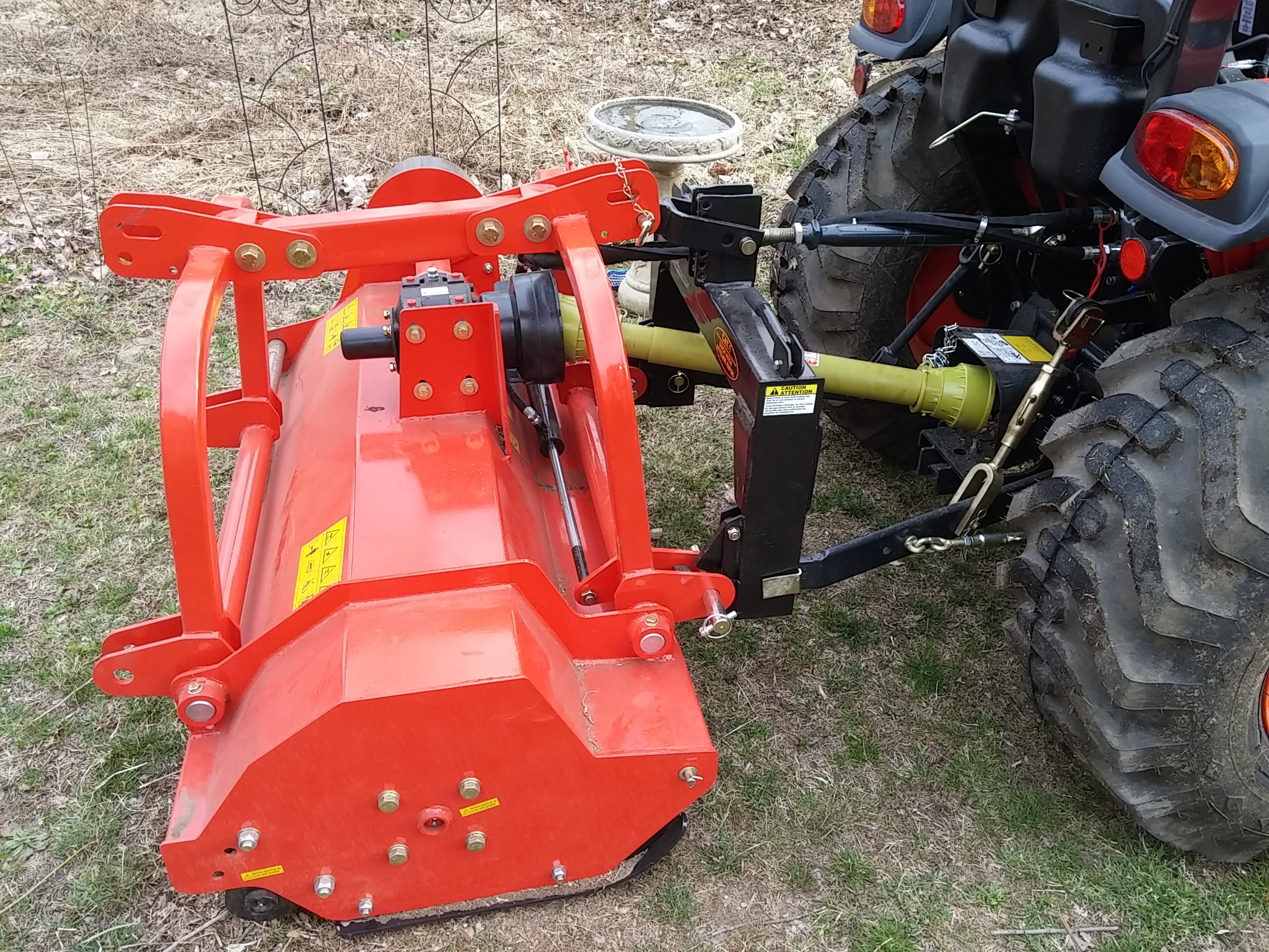 This my new flail mower, an AG-140. 54" cut, hydraulic side shift, 24 800g hammers. It strains the CK2610 a bit on startup, and I have to go slow in the thick stuff, but I am glad I went with the heavy duty version. I have "plowed" some not so flat areas, and while I have no rocks on the property, the hammers don't even look like they have been used.