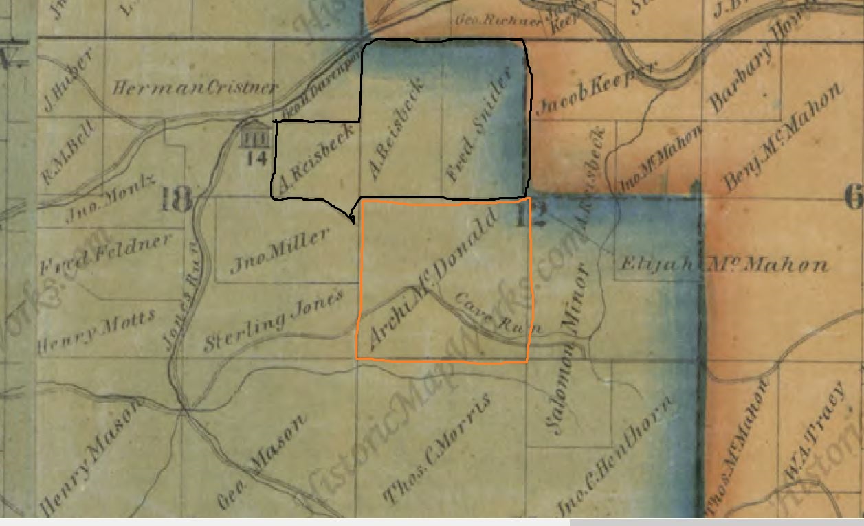 In 1869, the farm is split again, with A Reisbeck owning the barn section and the house section, and Fred Snider (later spelled schneider) owned the old house section. The roads shown west of the farm, outlined in black, are no longer there.