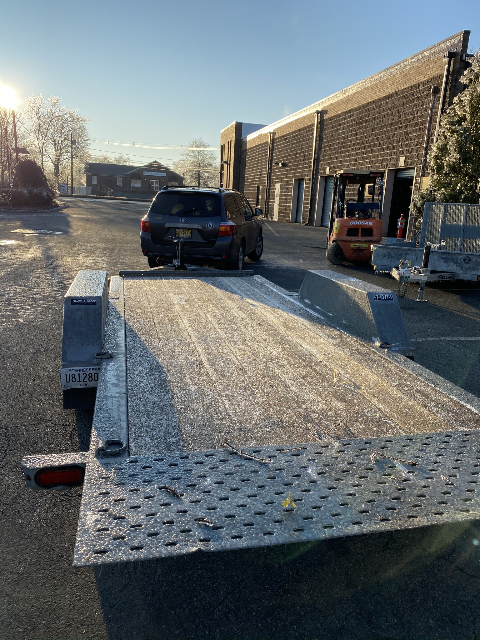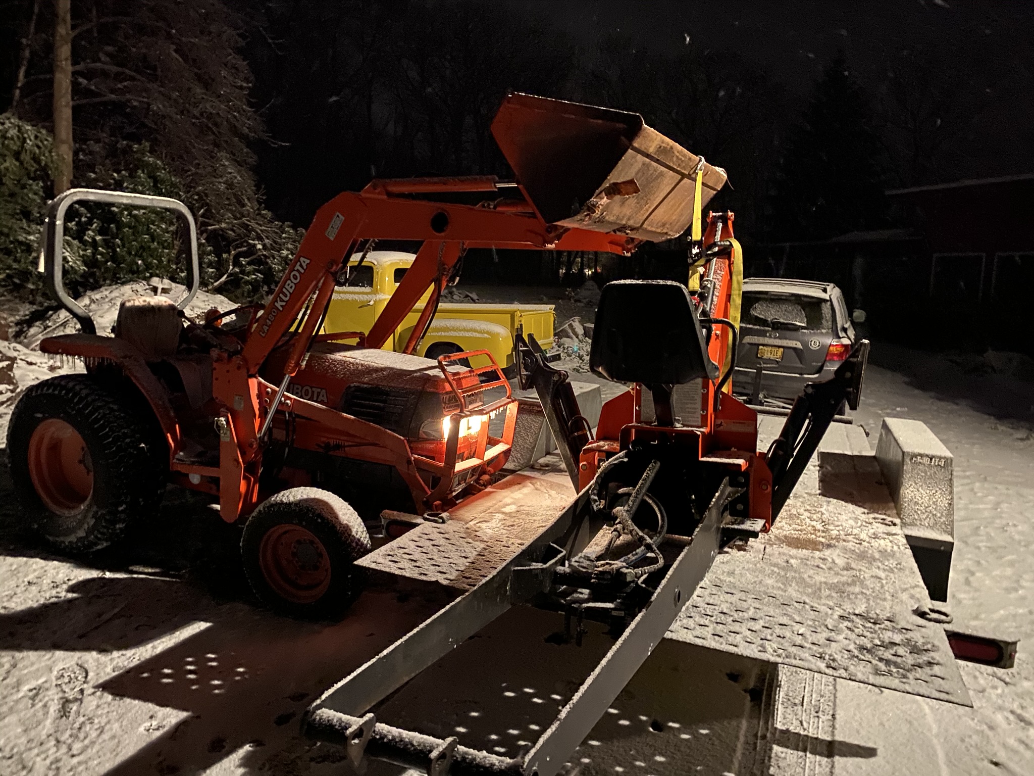 Used 4 3,333lbs straps to tie the backhoe to the trailer and 1 1lbs to tie top of the subframe to the trailer. By the time I got to the seller it started snowing in MA and I was bit nervous driving back through the endless mountains with the fresh snow on the ground - about an hour drive through local streets (40 mph speed limit) and 2:30 highway. Once I got the the highways I was relived.
