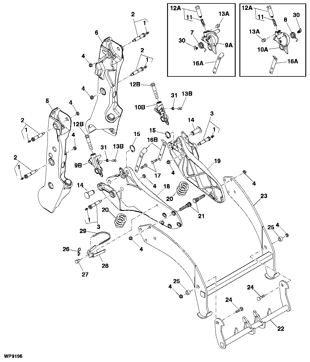 Youi need # 18, 20,21 on the first picture and # 26-29 on the second. They came with the FEL but never put them on and the dealer will send them to you. Bungying to the rail isn't a fix.