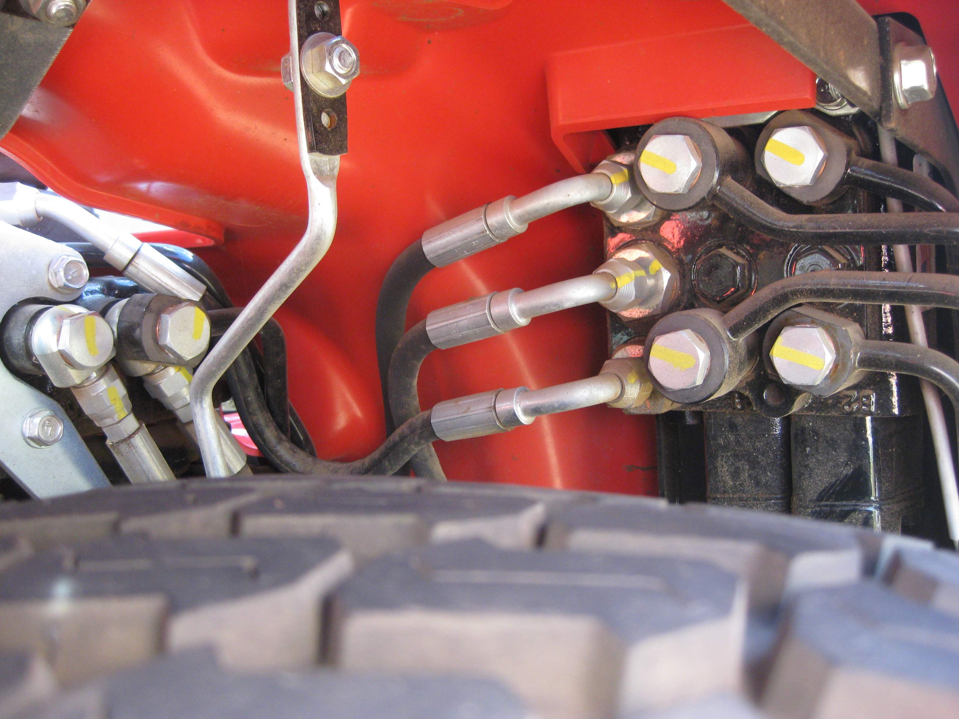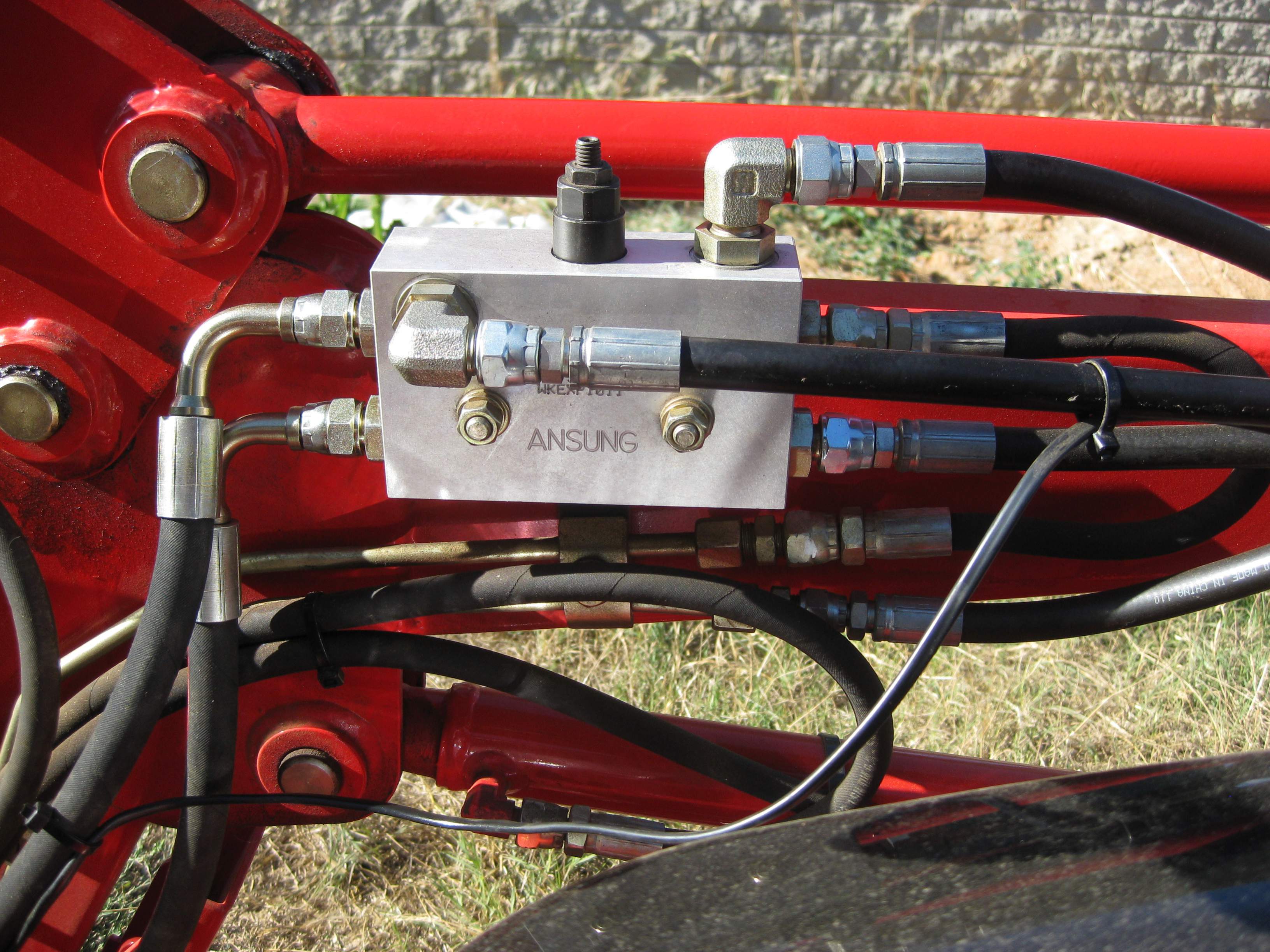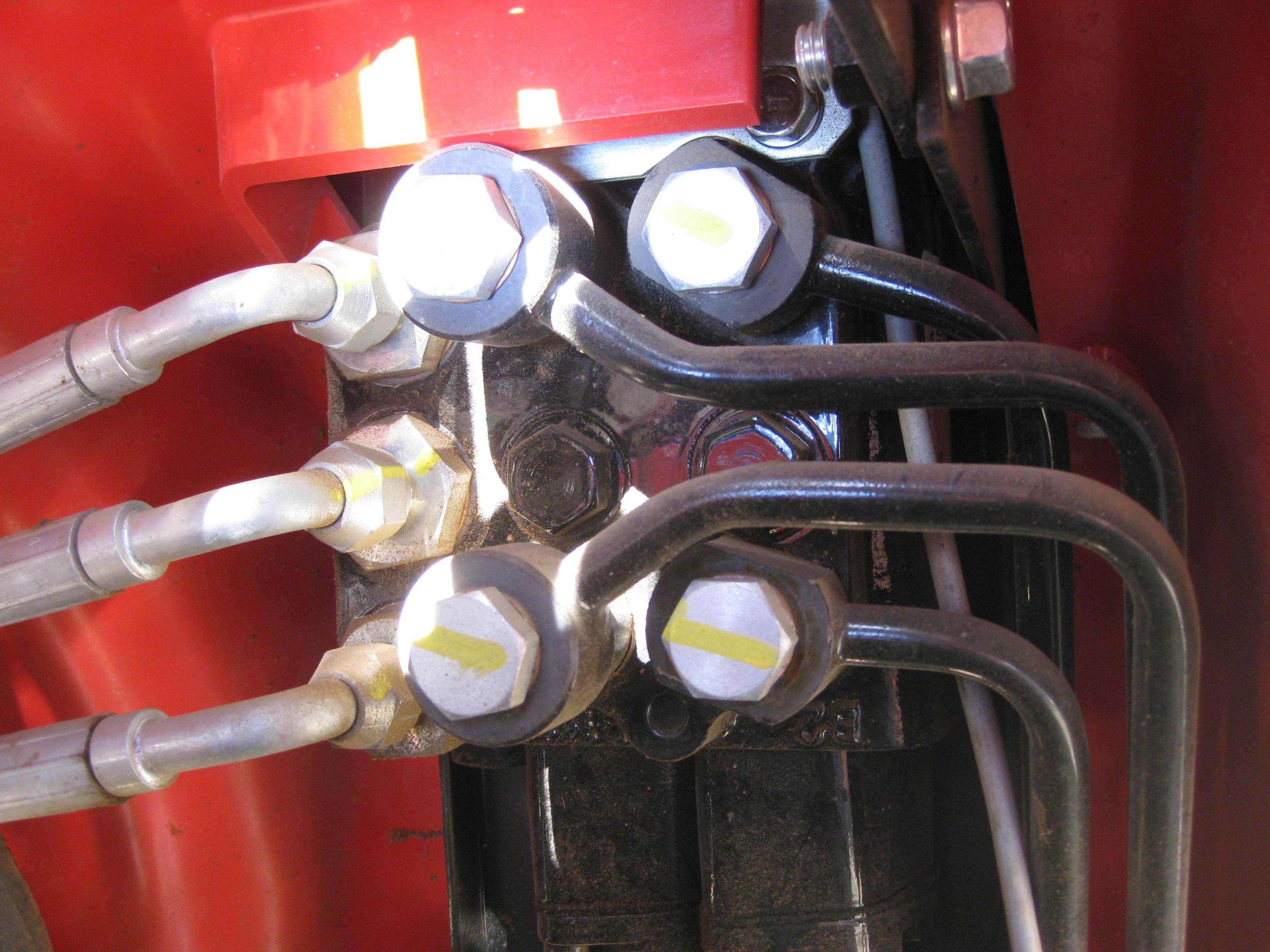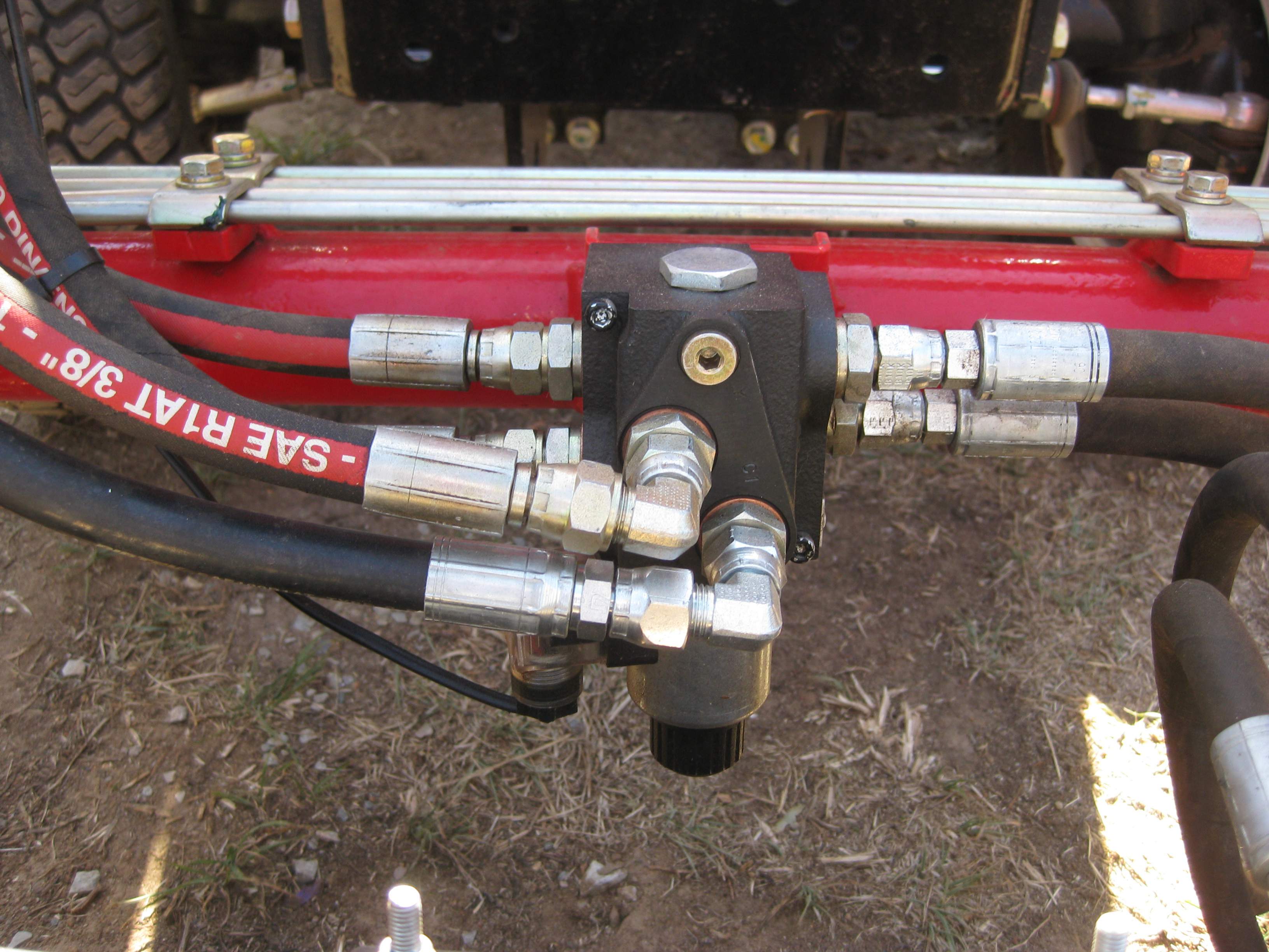 Yes - In between the FEL valve and the diverter valve, there is an aluminium "block" into which 3 of the 4 FEL hoses lead into and out from. The markings on the block for the hose connections are T1 - a paired connection for the bucket curl hose, T2 a paired connection for the loader lift, A for the in hose for the bucket dump and A1 for the out hose for the bucket dump. The FEL drop hose bypasses the block.
