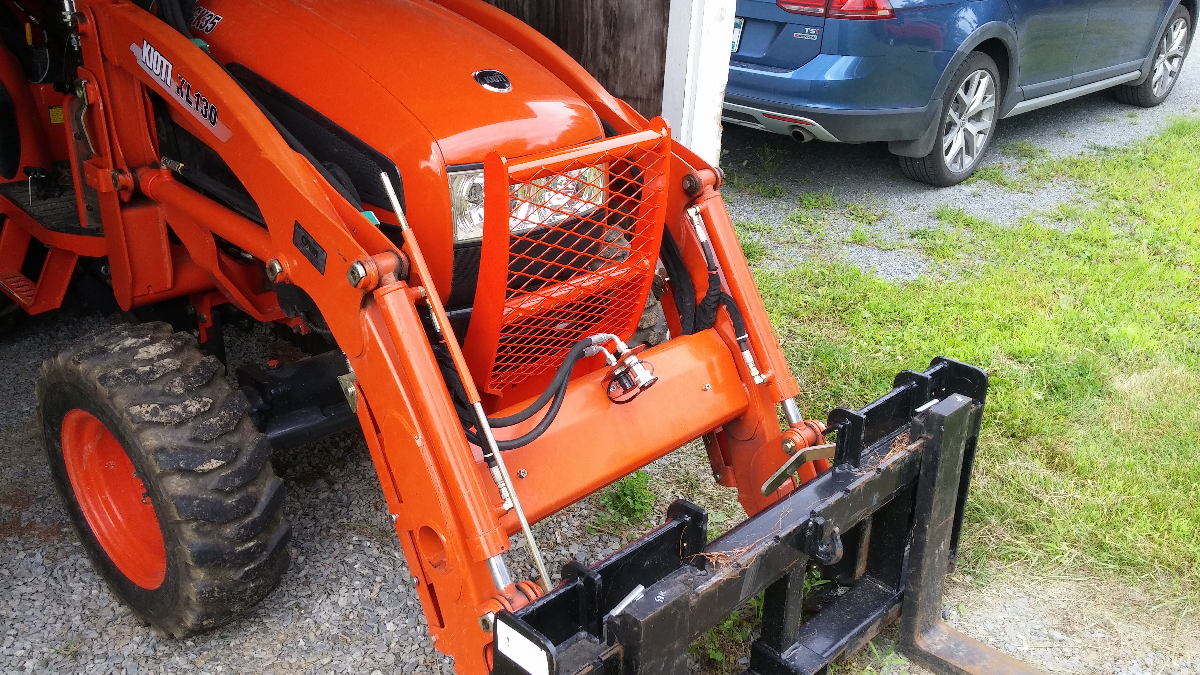 Bush hogging around my field last week without my loader on, I heard a crunch up front so I stopped to take a look and found a nice 2"dia branch shoved up through the plastic shroud below the hood into my battery. Luckily I stopped a soon as I heard it and no major damage done just a broken shroud that I can replace for $70. So I decided to add some expanded steel to the front guard went with larger mesh on top for the headlights. It should stop most everything now. Online metals has a great price on expanded steel ~8bucks for a 2x2 piece.