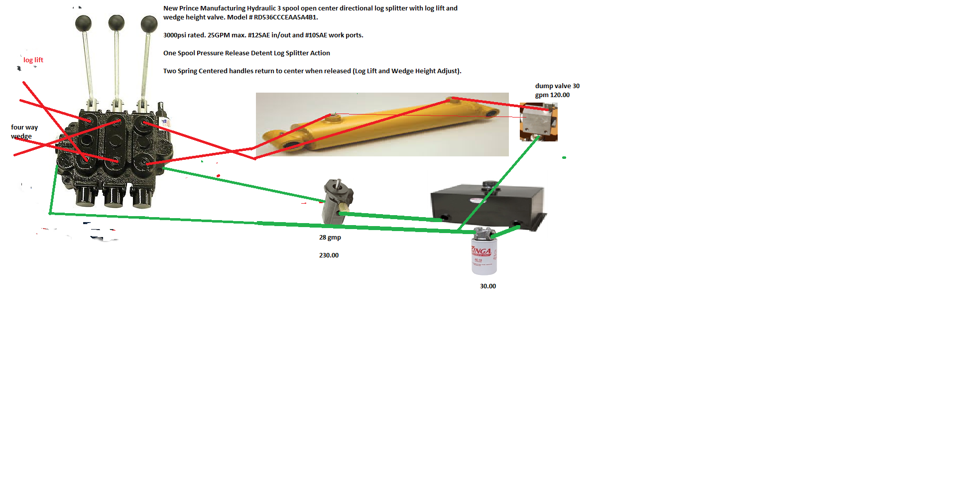 The pump supplies the lift/four way valve on the left first. And then the PB from that valve feeds the auto cycle. Each valve has a return to the tank.