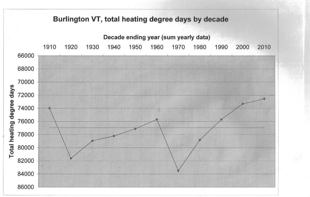 I took the records from Burlington VT"s weather station as archived by NOAA ( Best available source and the data was not collected with our question in mind.)and added up all the "heating degree days for each decade. That shows the sum total of the heat available for each decade and evens out all the day to day and one time events. If the climate was stable and not changing it shoud plot a pretty flat line. Instead I get this. I think the early data is suspect as they have moved the weather station at least once from the train station to the airport so any urban island effect stops abruptly. But the last thirty years should be pretty sound and show a steady warming trend.