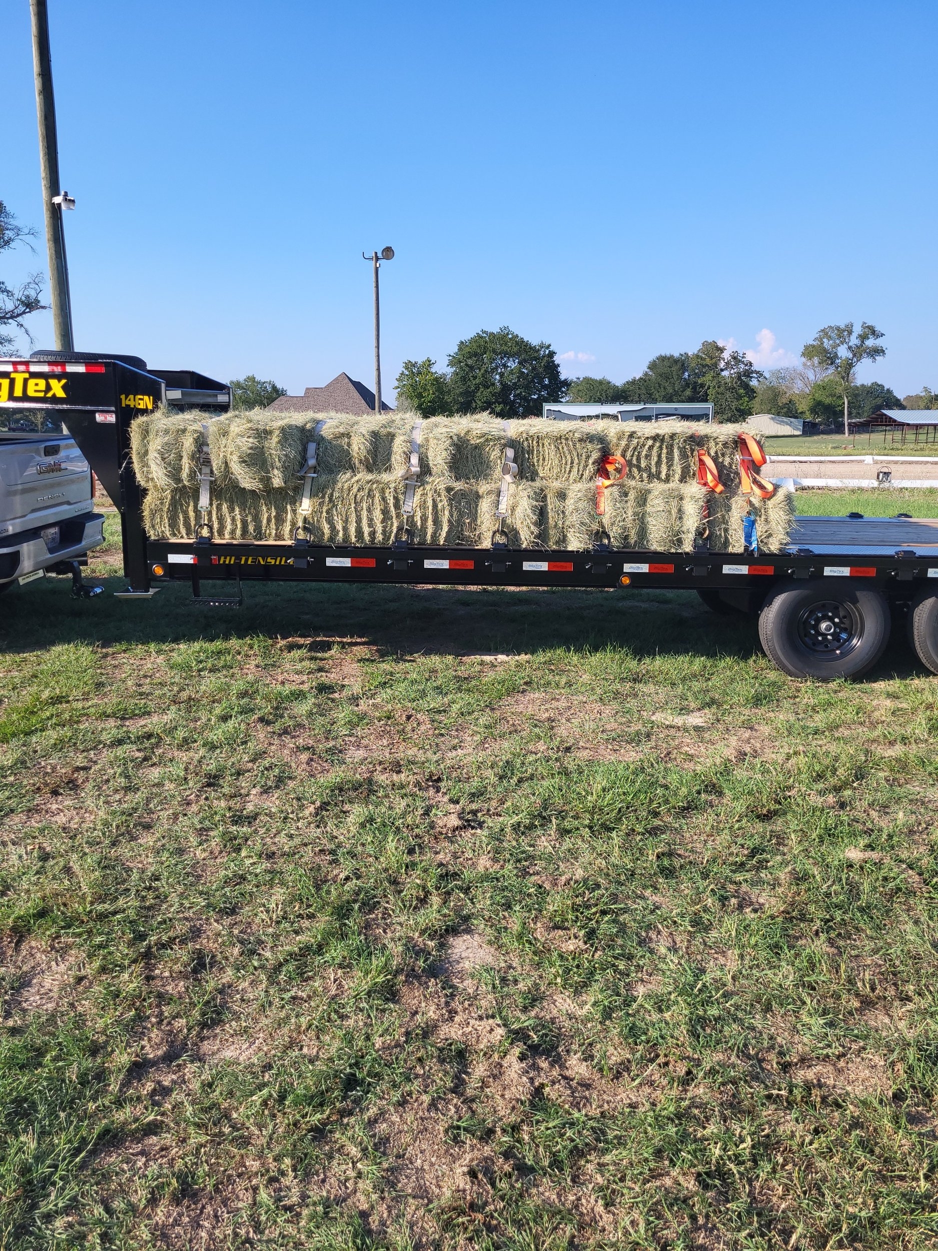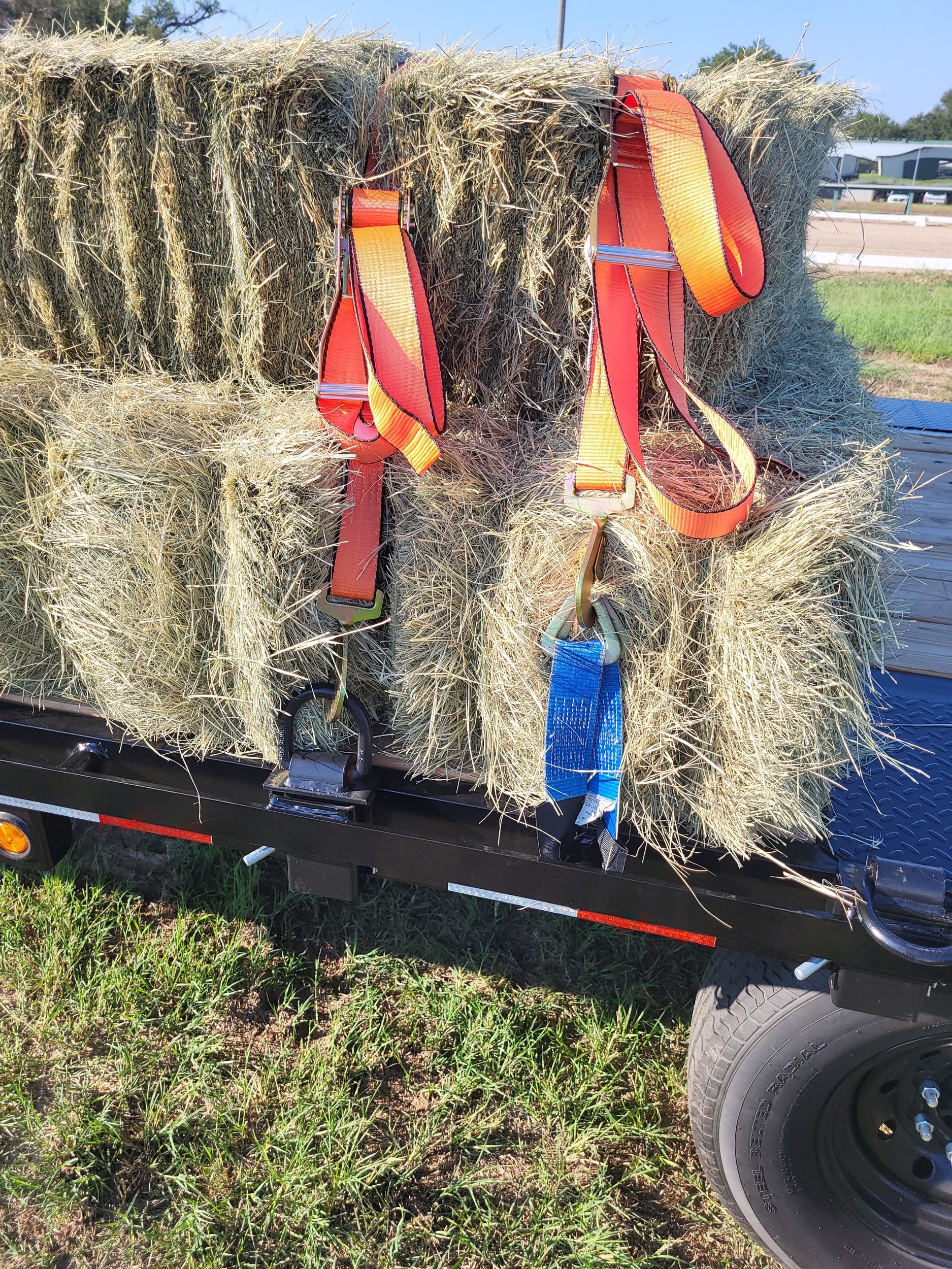 I usually load 100 bales of hay. On the flat side, I can get five layers, twenty bales each. This load was loaded with a grapple. My hay supplier uses an accumulator to gather his small bales then picks them up with the grapple. He cannot get them into his hay barn which I will explain later but he does easily load them onto wagons to get the bales out of the weather until his customers can pick them up. The grapple picks up eight bales at a time. Two "drops" leaves room for four more bales plus a little extra so on this load, I placed the last two on the flat to just about touch the ramps. My guy only had 94 bales on hand and the last one was a "starter" bale, ie; the first one baled and a bit loose so I ran the rear two straps in an "x" pattern to ensure that it stayed put.