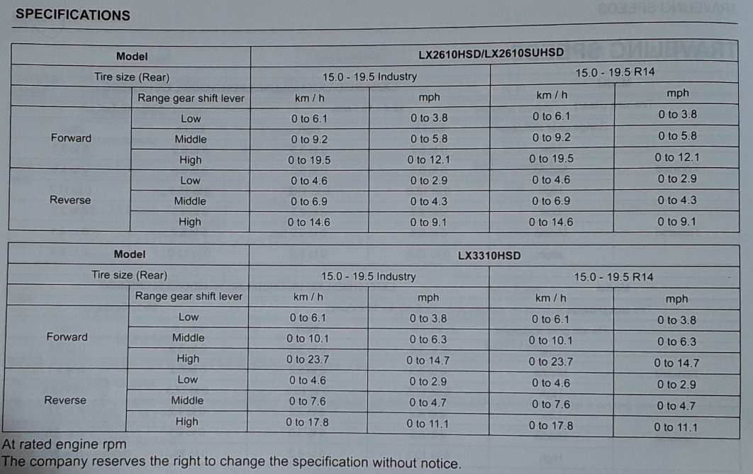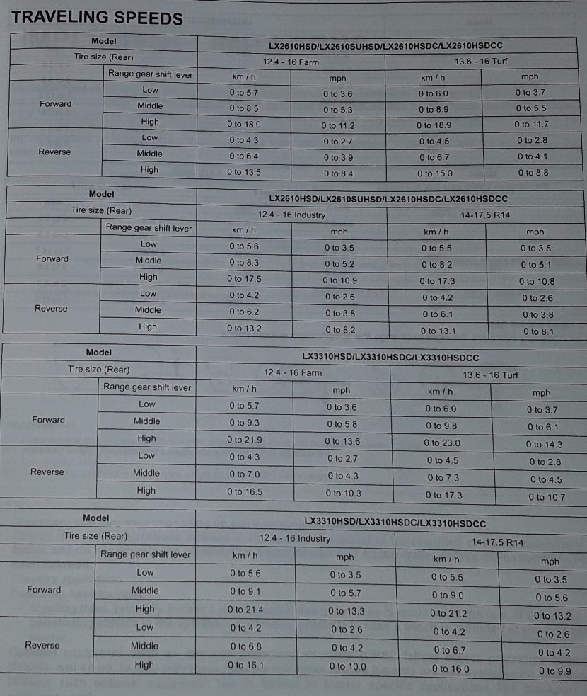I included a screenshot of my spreadsheet, revised from the B3350 to LX3310 with tire options. It has the older L models for comparison (the newer L3301/L3901 are close but slightly heavier and slightly more power). I assume Titan-brand tires on all of them (only feeds into the diameter spec).